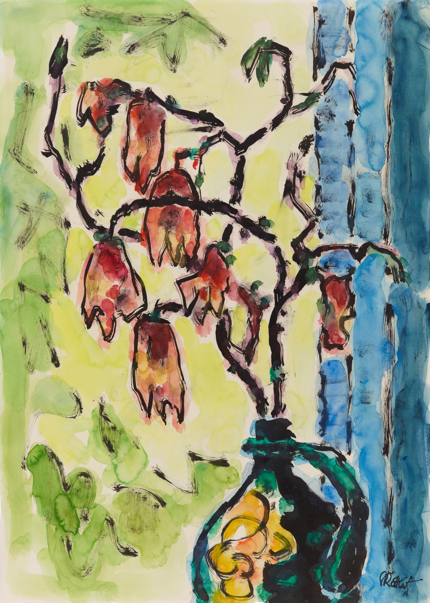 Karl Schmidt-Rottluff's 1969 watercolor on paper featuring a magnolia branch, demonstrating the artist's expressionist approach to nature studies. The delicate medium captures the botanical subject with emotional intensity.