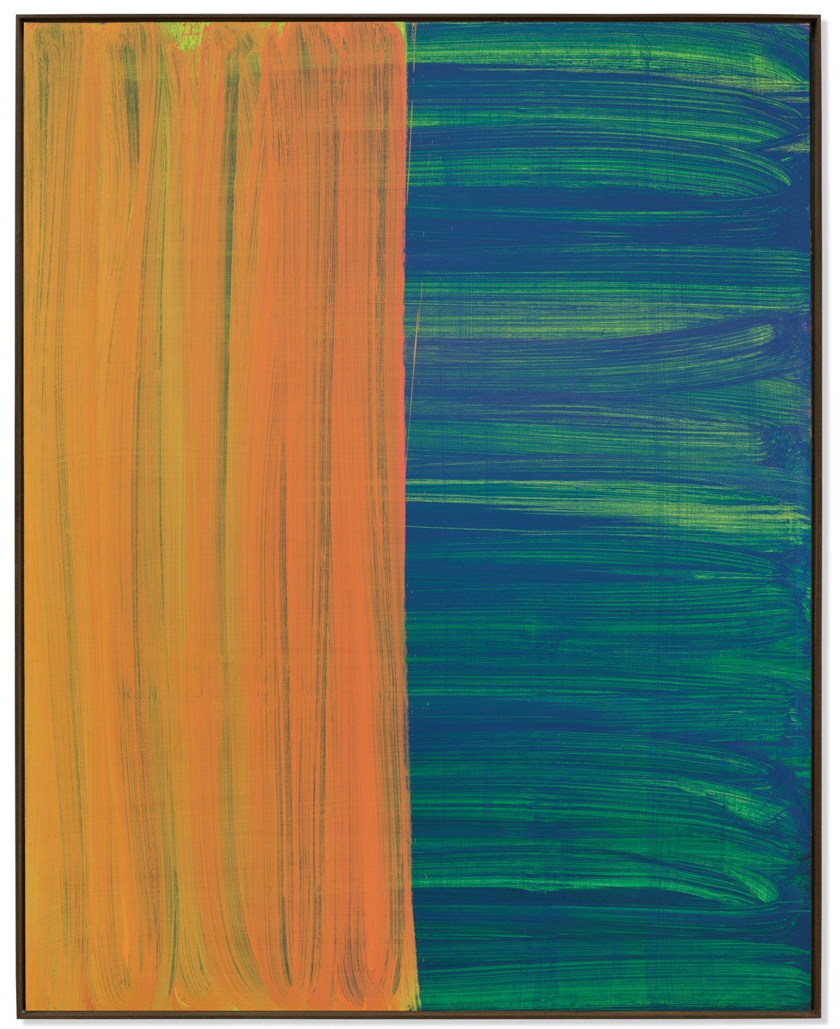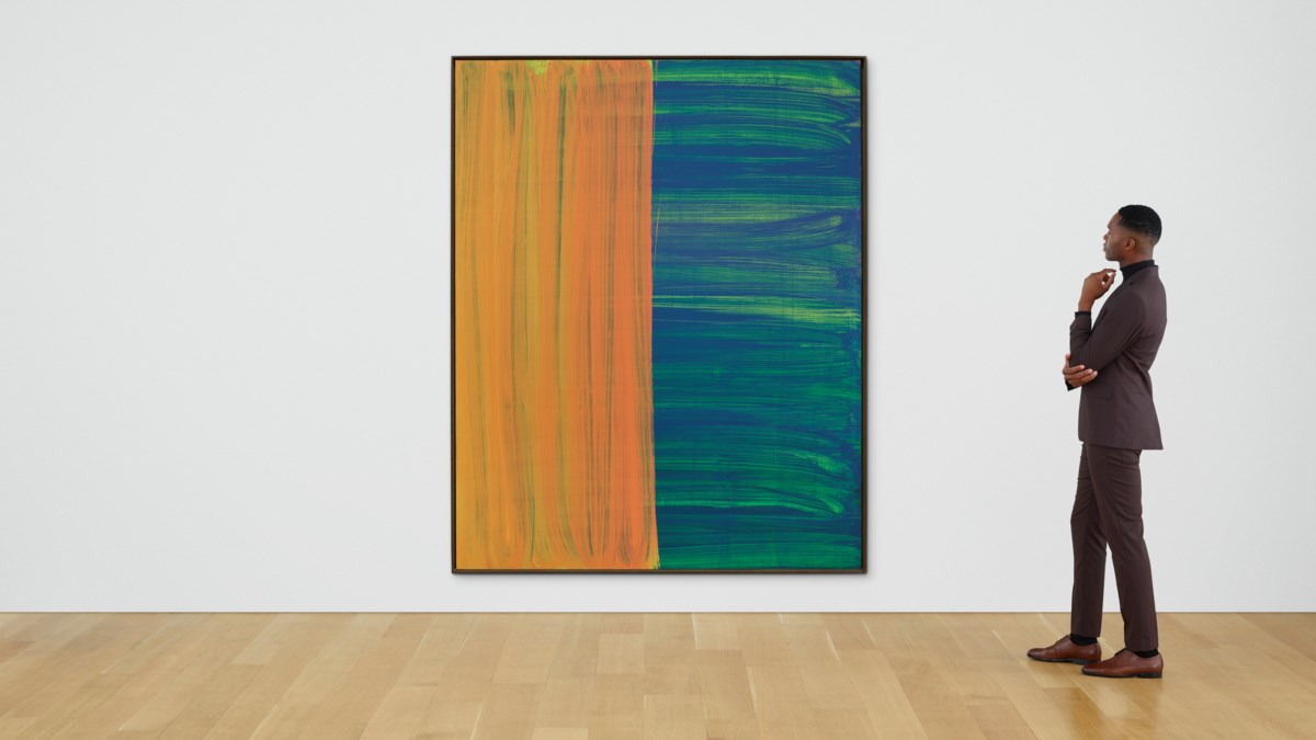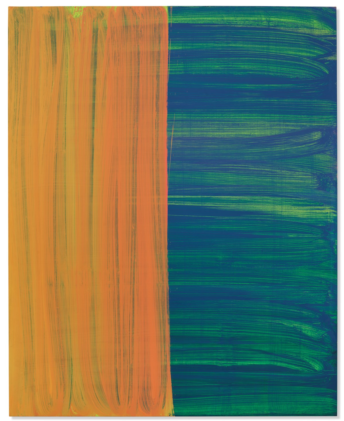 A dynamic explosion of vivid, overlapping color fields sweeps across the canvas in Katharina Grosse's characteristic style, dissolving the boundaries between form and space. Bold swaths of pigment appear to defy gravity, creating a sense of turbulent, kinetic energy that challenges conventional notions of painting. The work embodies Grosse's radical approach to color and scale, transforming the canvas into an immersive environment of pure painterly sensation.