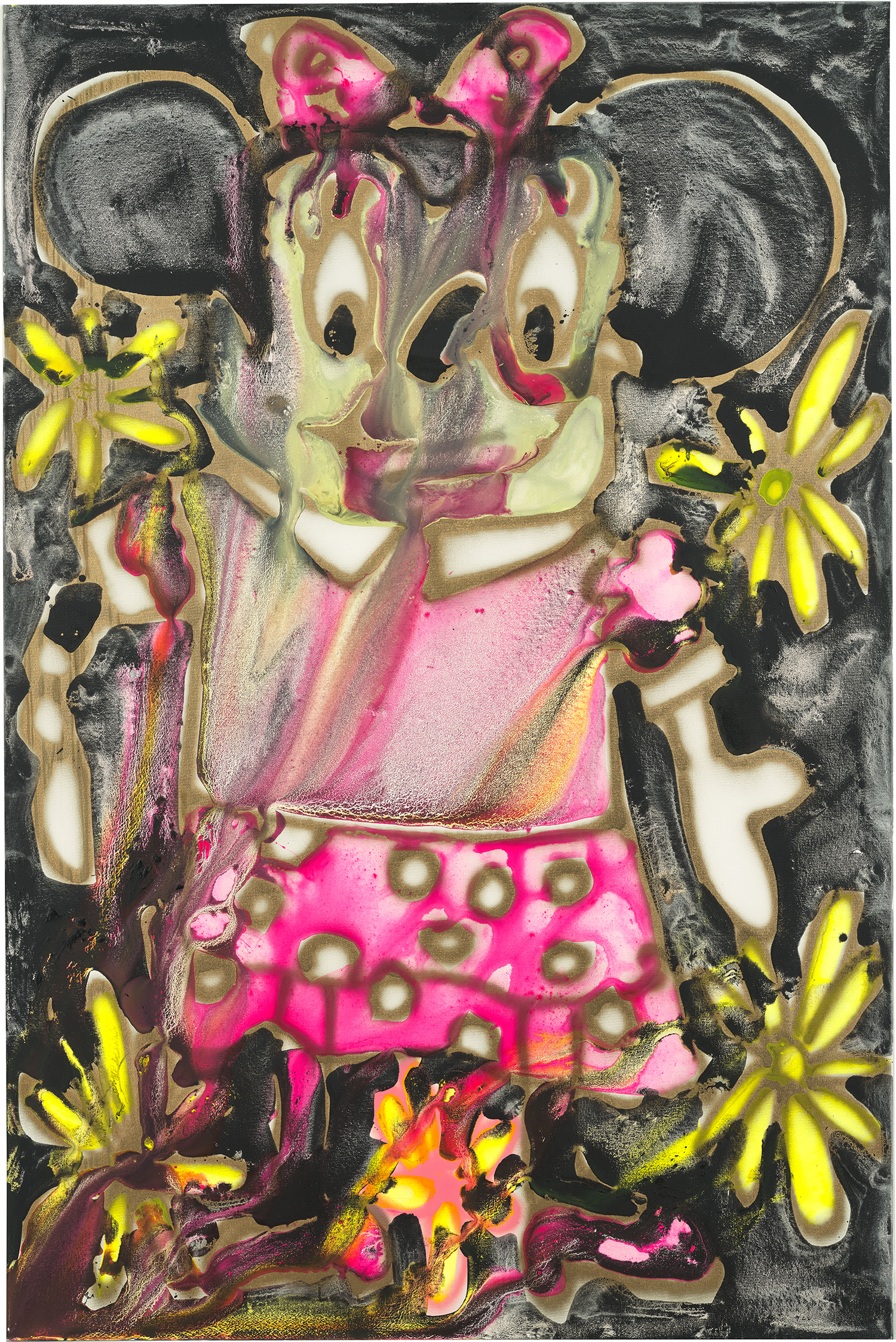 A large-scale acrylic and spray paint work on canvas depicting Minnie, combining painterly and street art techniques. The piece exemplifies Bernhardt's vibrant, contemporary approach to canvas painting.