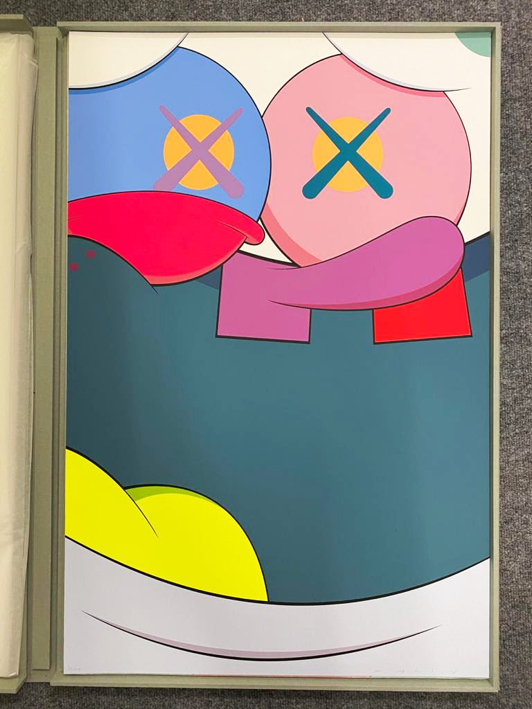 Blame Game Print No. 1 demonstrates KAWS' distinctive visual language through a bold screenprint composition that exemplifies the artist's mastery of graphic design and conceptual clarity. Executed in 2014, this work is part of the artist's Blame Game Portfolio and represents the first print in that series, rendered on premium Saunders Waterford 410 gsm High White Paper. The substantial sheet size of 35 by 23 inches allows the composition to command presence, while the screenprinting technique showcases KAWS' technical precision in layering color and form. This is edition 100 of a limited run, and the work bears the artist's signature, confirming its authenticity and collectible status. The print captures KAWS' characteristic approach to transforming recognizable imagery through his signature formal vocabulary, which bridges street art sensibilities with fine art refinement. The work's conceptual framework, suggested by the portfolio title "Blame Game," engages with themes of responsibility and agency while maintaining the visual sophistication that has made KAWS' work highly sought after among contemporary collectors. The choice of high-quality paper and professional printing process elevates the work beyond commercial production, positioning it as a serious artistic statement that rewards close examination and reflects the artist's continued investment in the integrity of printed media as a fine art practice.