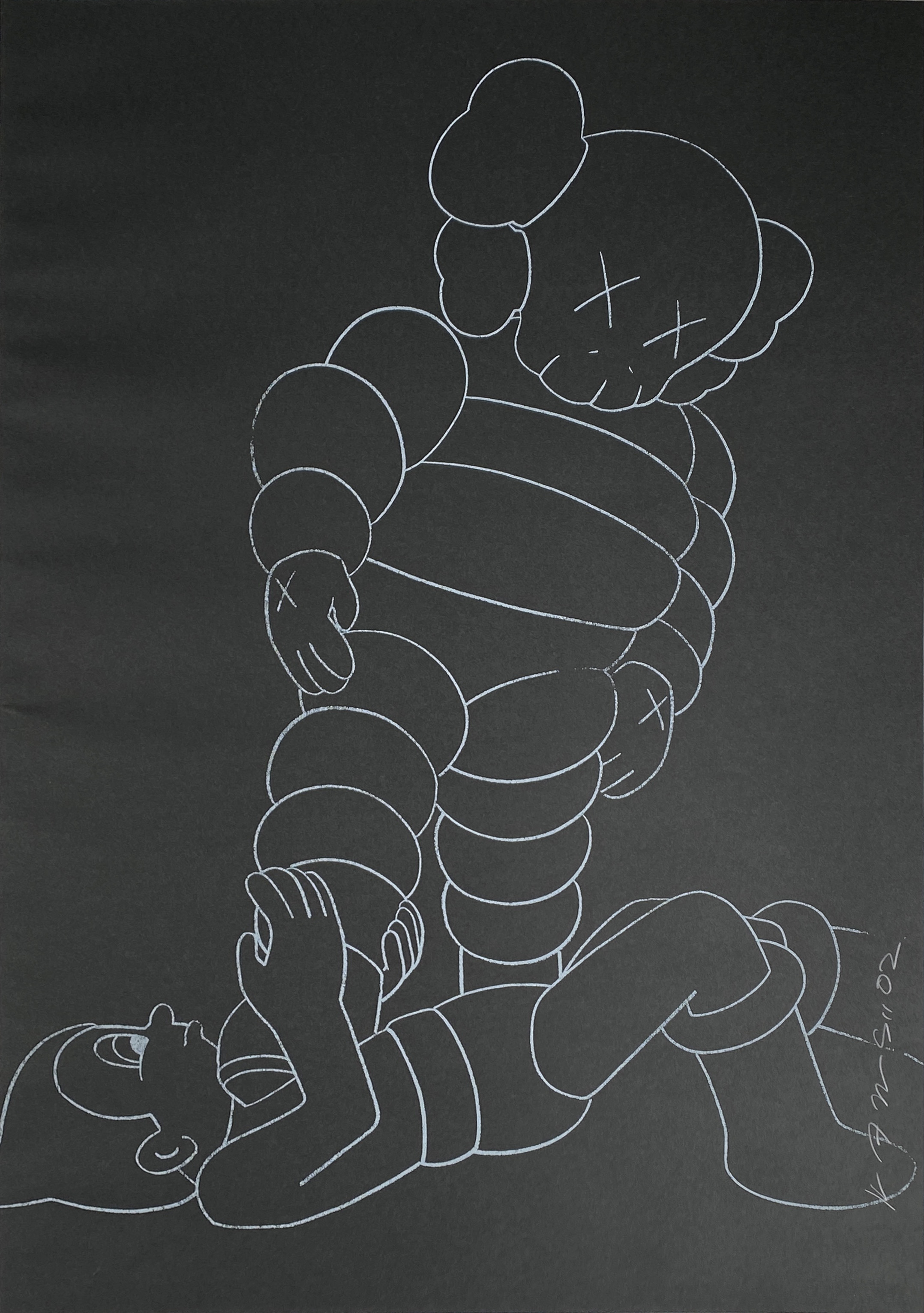 This screenprint showcases KAWS's signature appropriation strategy, reimagining the iconic Astro Boy character through his distinctive cartoon aesthetic. The work exemplifies the artist's early exploration of pop culture mythology, blending his original Chum character with beloved animated figures to create a provocative dialogue between commercial imagery and fine art.