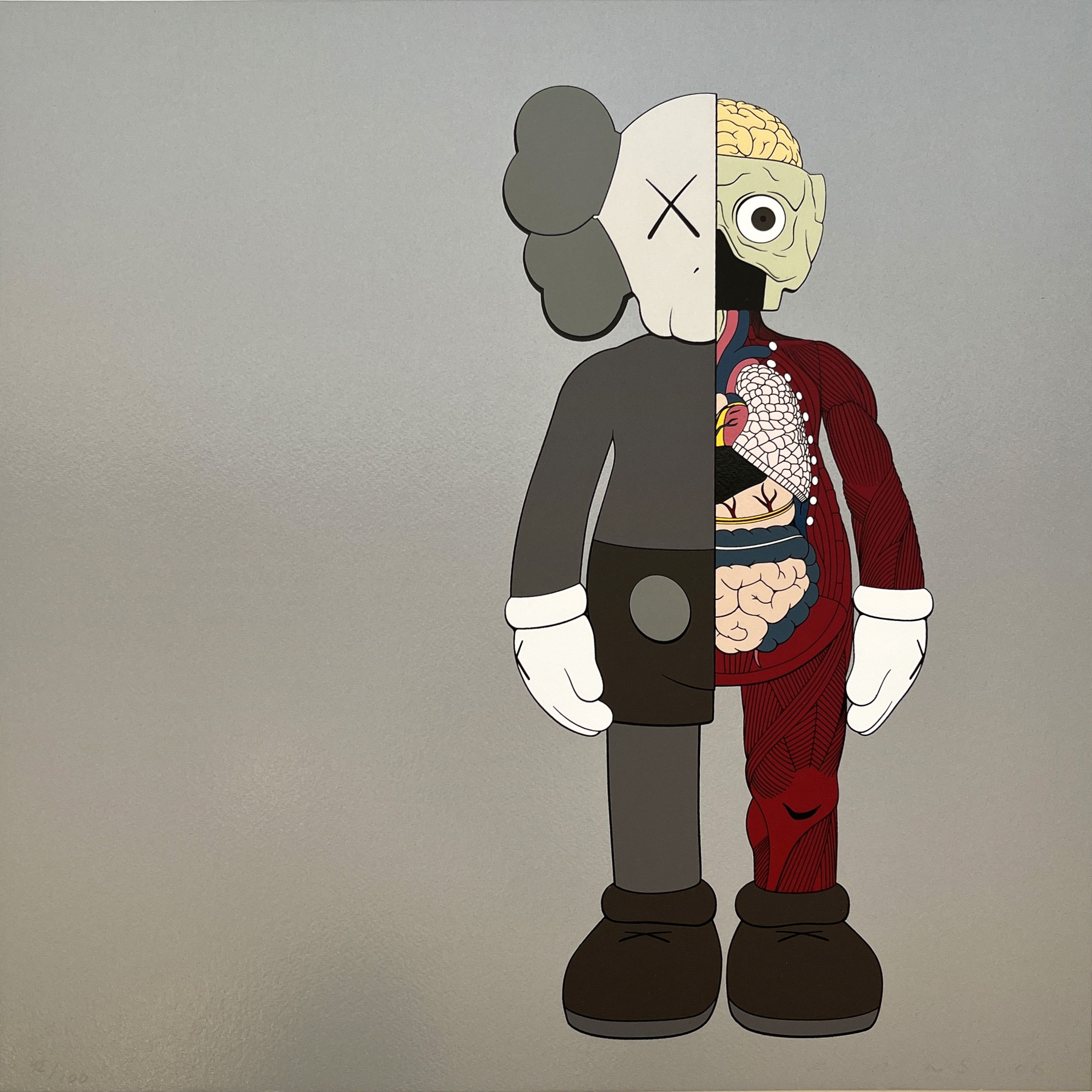 This screenprint presents KAWS's iconic Companion figure in a cutaway view revealing its internal anatomy, exemplifying the artist's signature blend of cartoon aesthetics and surgical precision. The brown colorway and dissected motif reflect KAWS's ongoing exploration of mortality and vulnerability within pop culture iconography.