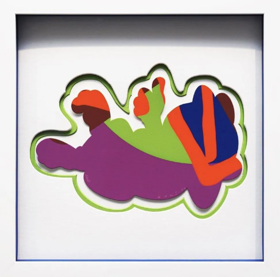 KAWS' Garfield is a screenprinted cartoon character with distinctive die-cut edges, blending Pop Art sensibilities with contemporary street art aesthetics. The work reinterprets a familiar cultural icon through the artist's signature style.