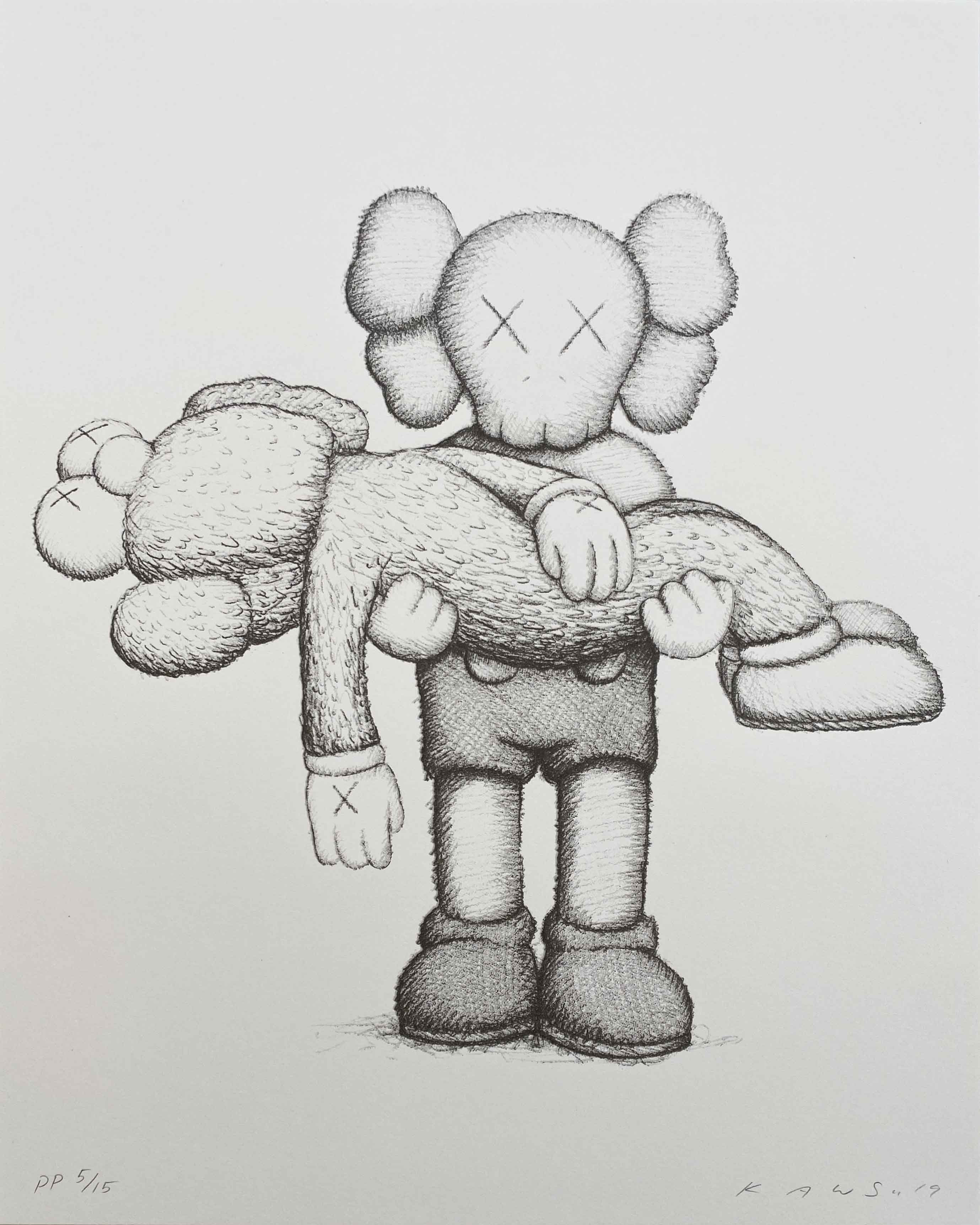 This 2019 screenprint showcases KAWS' signature cartoon-inspired aesthetic through his iconic "XX" motif, rendered on premium Saunders paper that emphasizes the work's bold graphic elements. Part of a substantial edition of 750, "Gone" demonstrates the artist's mastery of printmaking techniques while maintaining the accessibility that defines his practice.