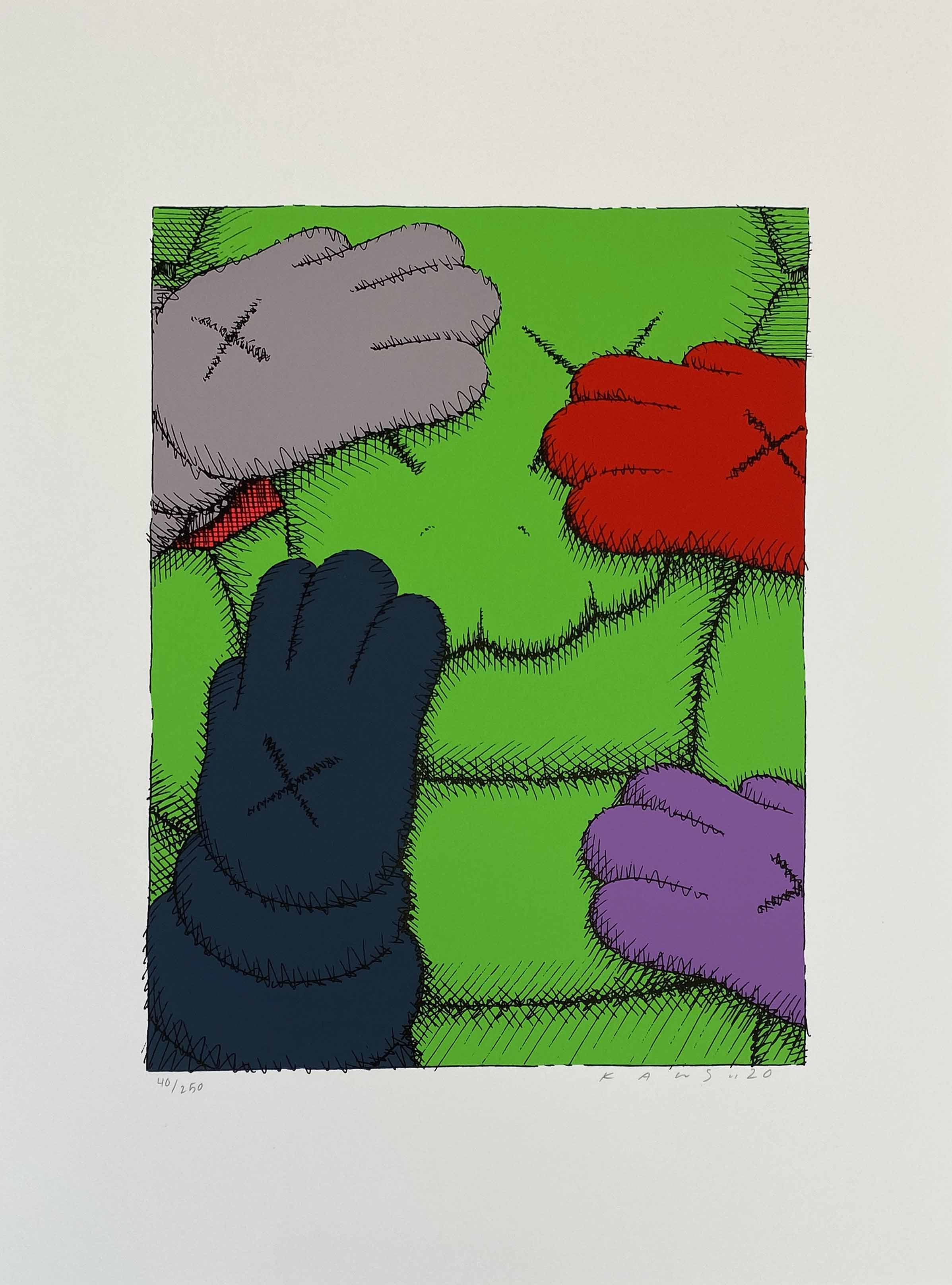 This silkscreen print exemplifies KAWS' distinctive cartoon-inspired aesthetic, featuring his signature "X-ed out" eyes motif that transforms familiar characters into melancholic figures exploring themes of alienation and consumer culture. Printed on high-quality Saunders Waterford paper, the work demonstrates the artist's continued mastery of printmaking techniques within his broader exploration of popular iconography.
