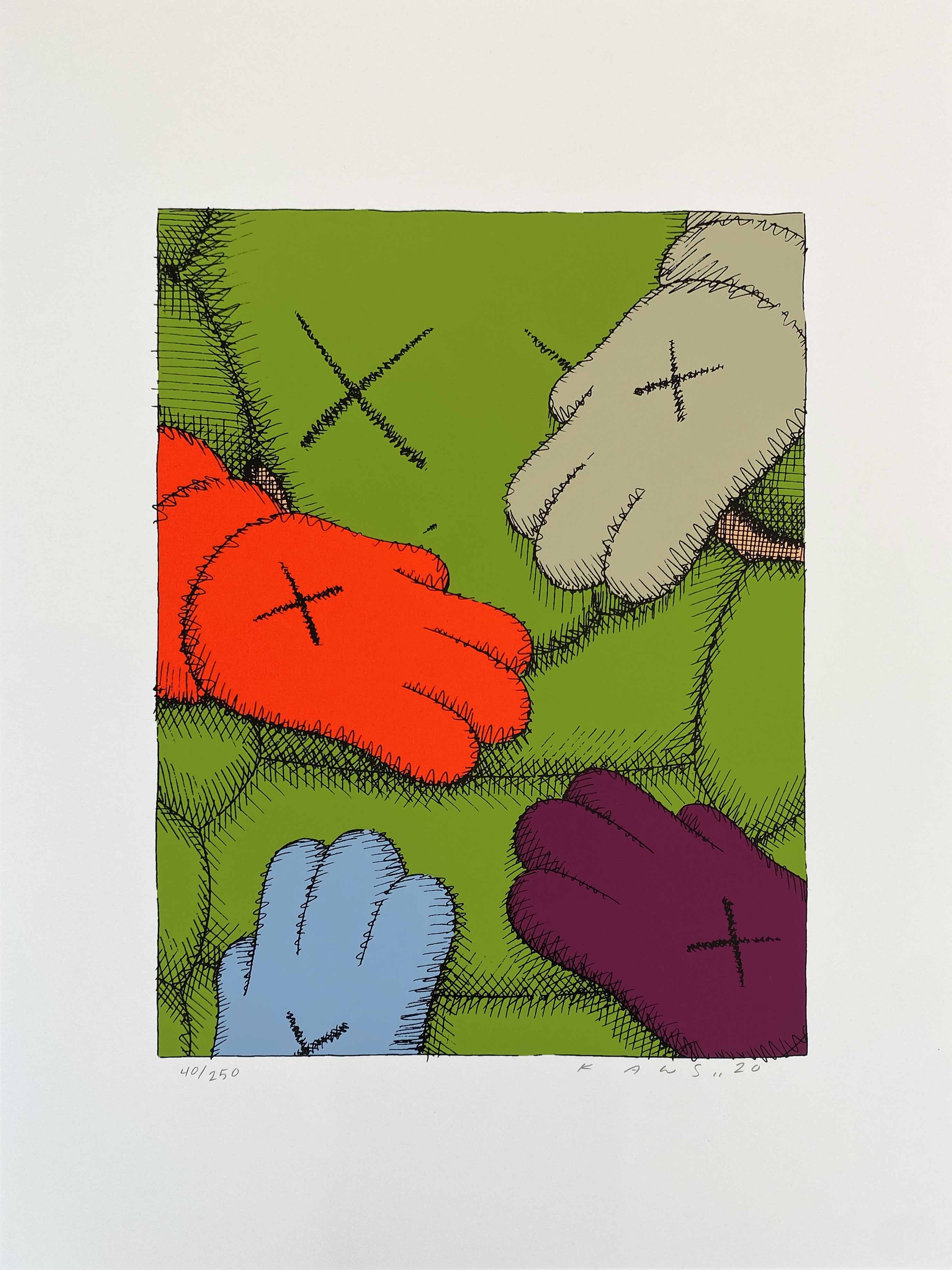 This silkscreen print exemplifies KAWS' signature approach to reimagining beloved cartoon characters through his distinctive visual language of X-ed out eyes and skull-and-crossbones motifs. Executed on high-quality Saunders Waterford paper, the work demonstrates the artist's mastery of printmaking techniques while maintaining the bold graphic sensibility that defines his practice.
