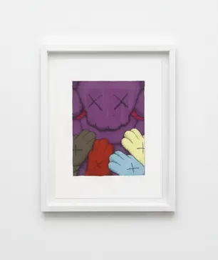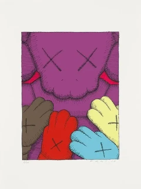 A vibrant screenprint featuring KAWS' character design rendered in deep purple tones. The work exemplifies the artist's consistent exploration of playful abstraction across varied color palettes.