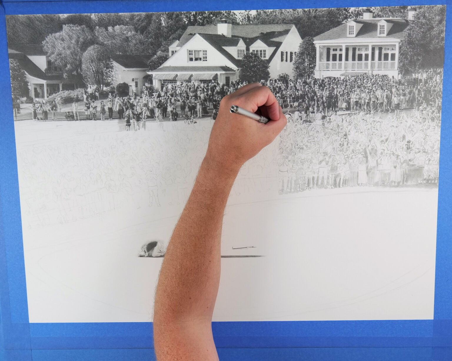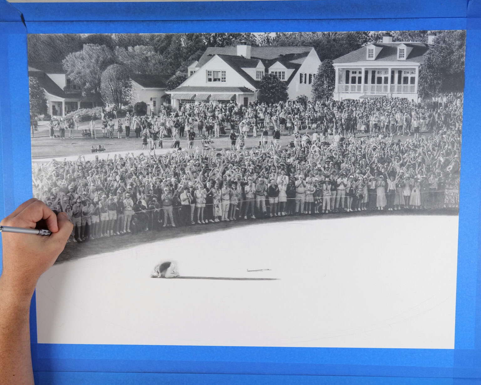 Over 600 hours went into the creation of this drawing. The artist states the time investment was driven by the demands of the image itself rather than perfectionism. The work depicts the Augusta National terrain, crowd, and architecture with layered compositional precision.