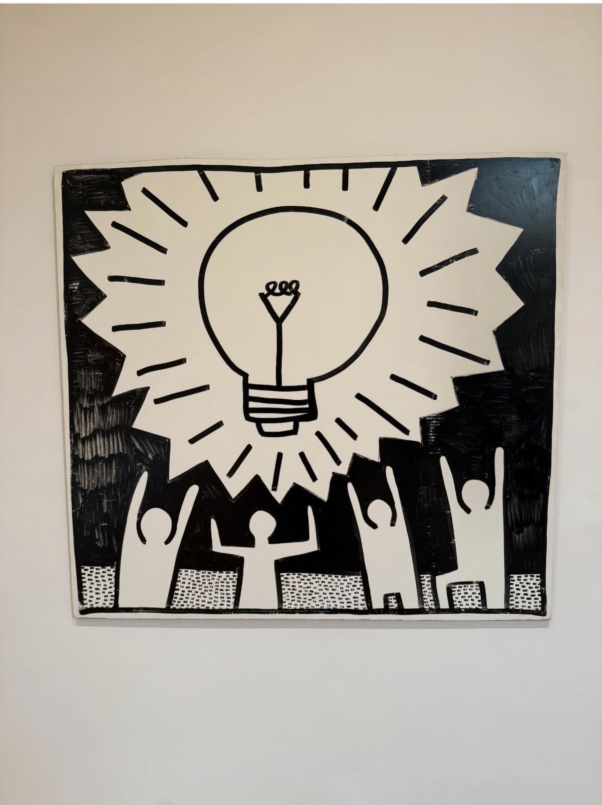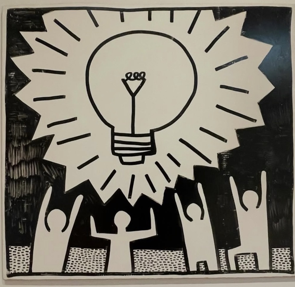This iconic screenprint by Keith Haring features a central glowing light bulb surrounded by radiant lines, held aloft by three simplified human figures rendered in his signature bold black line style. The composition exemplifies Haring's universal visual language of hope, enlightenment, and collective human energy. The work demonstrates the artist's characteristic use of high contrast black and white imagery with crosshatched details, creating a powerful graphic statement typical of his socially engaged practice.
