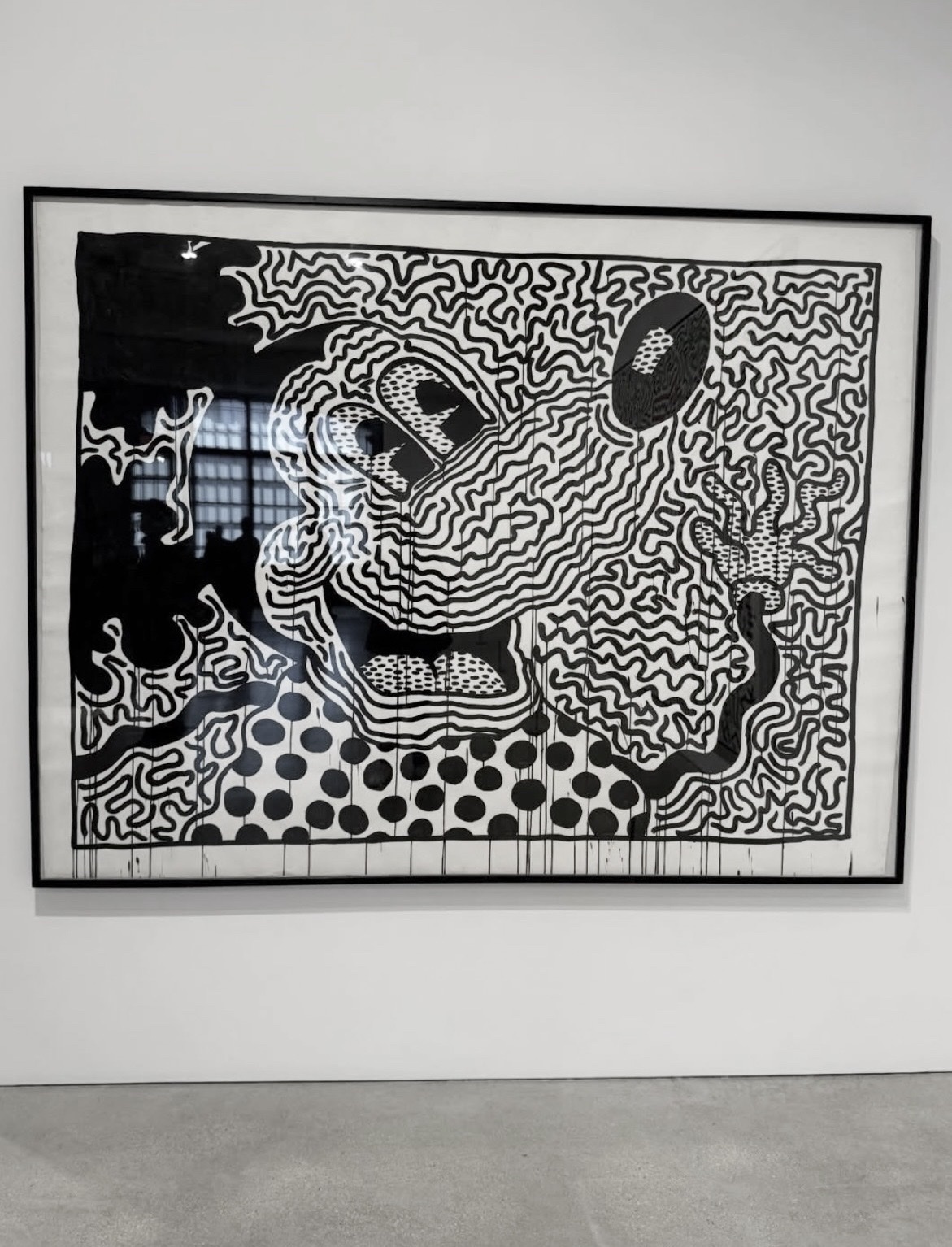 A striking black and white screenprint featuring Keith Haring's signature bold graphic style with interlocking organic forms, dotted patterns, and maze-like linework. The composition includes characteristic biomorphic shapes rendered in high contrast with dripping paint effects along the bottom edge. This work exemplifies Haring's visual language of accessibility and energy, combining pop culture aesthetics with abstract expressionist sensibilities.