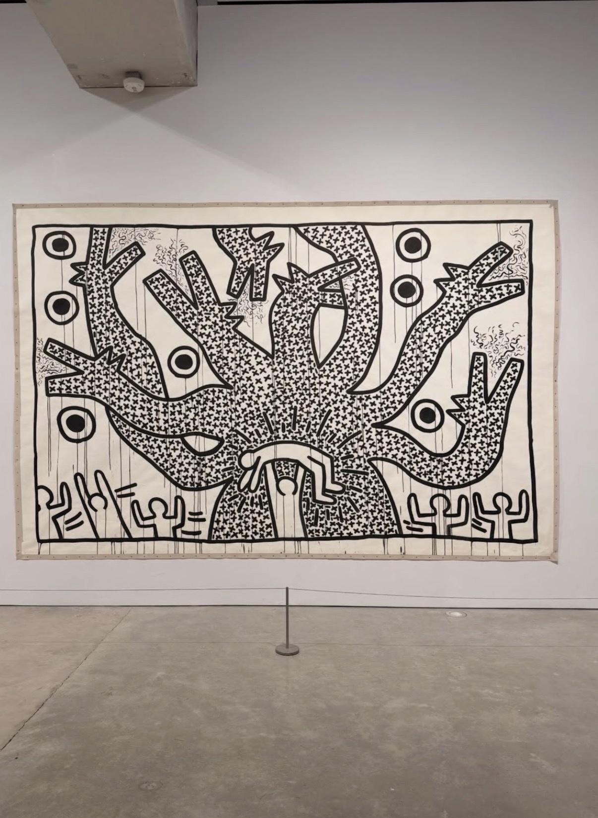 Basquiat worked in the same New York street art milieu as Haring, creating large scale black ink drawings packed with raw figurative imagery, mythological references, and urgent gestural mark making that bridges ancient symbolism with contemporary urban culture.