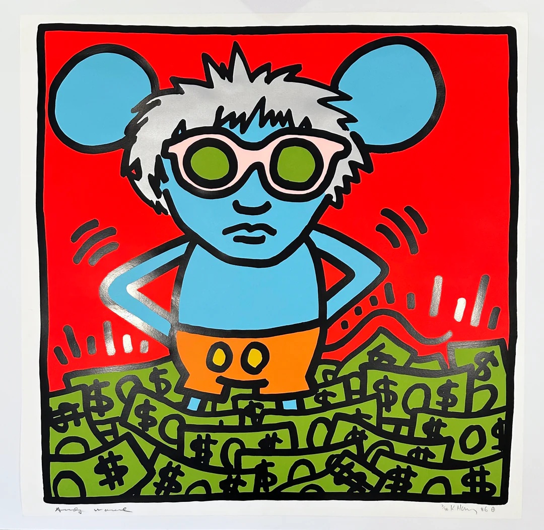 A vibrant screenprint from Keith Haring's iconic 1986 Andy Mouse Portfolio, created in collaboration with Andy Warhol. This work features Haring's signature cartoon character—a mouse with oversized ears and glasses—standing atop a pile of dollar bills, merging Warhol's Mickey Mouse imagery with Haring's bold line work and social commentary. Hand signed and dated in pencil by Haring ('86), this piece from the rare edition of 30 exemplifies the playful yet critical dialogue between two titans of contemporary art. Referenced in Littmann pp. 64-65.