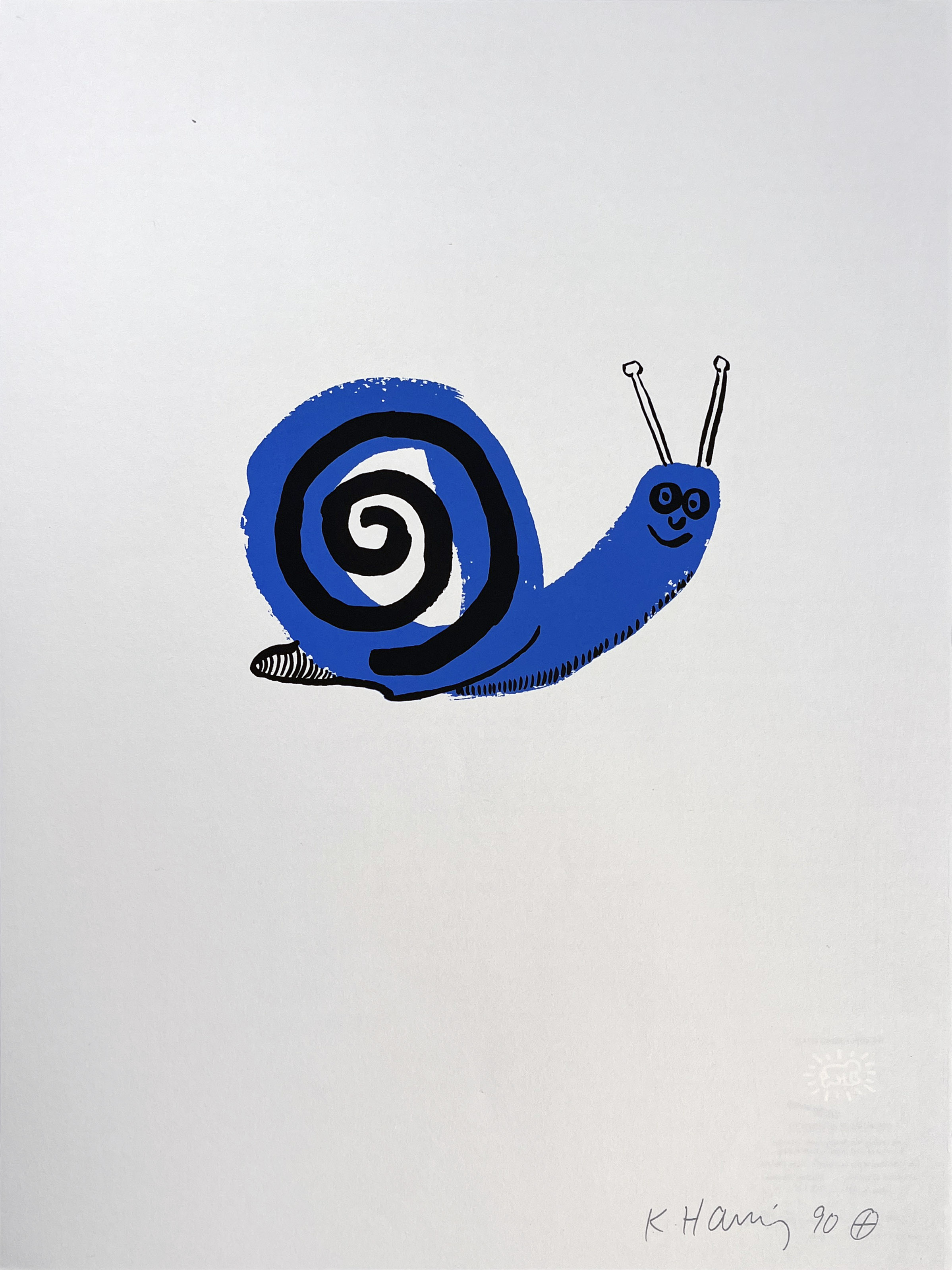 This lithograph exemplifies Haring's mastery of printmaking through bold contrasts of red and blue figures engaged in his characteristic dynamic movement, created during his mature period when he increasingly explored color relationships and narrative sequences within his iconic visual vocabulary of dancing, interlocking forms.