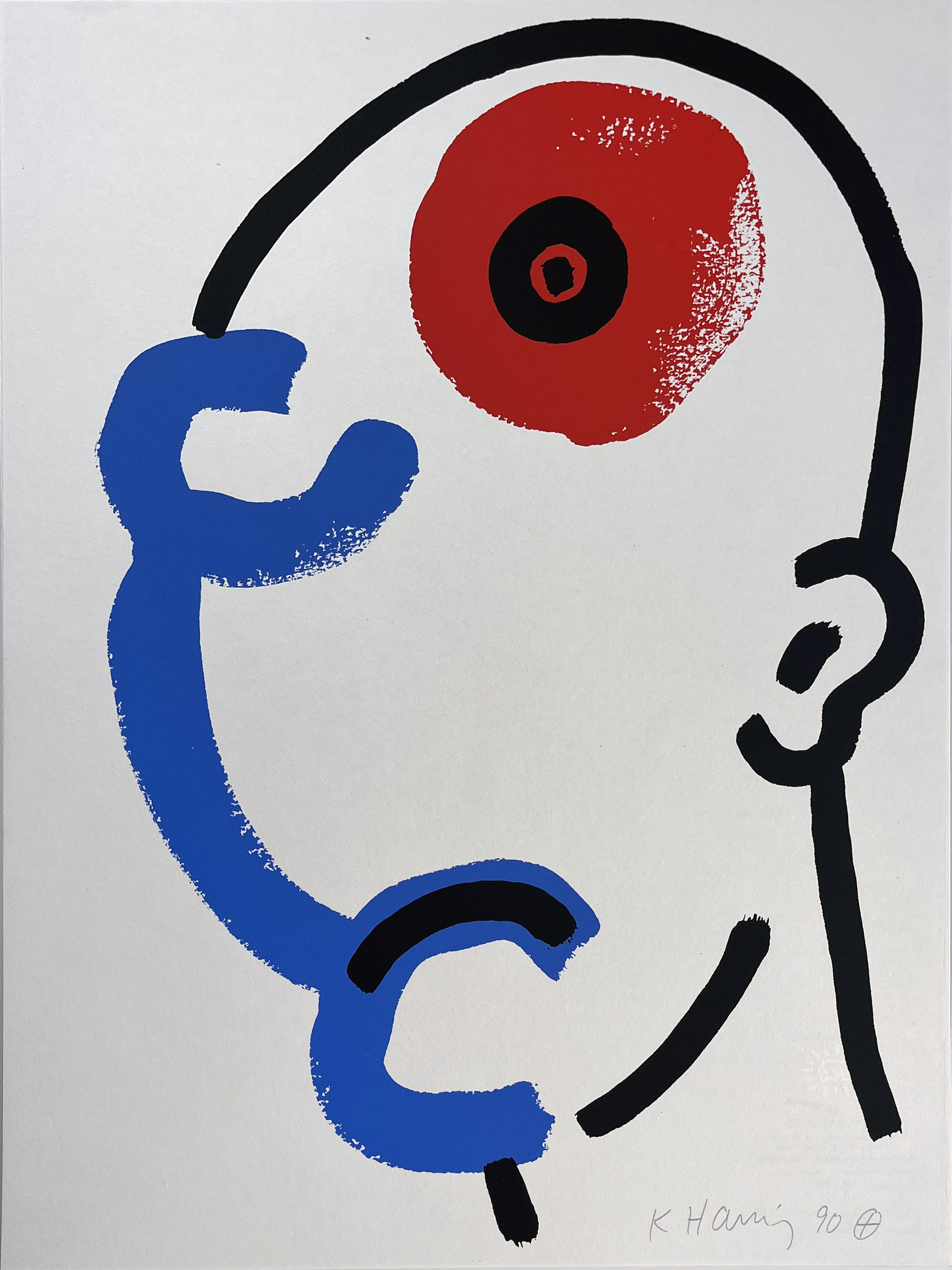 This lithograph from Haring's celebrated "Story of Red and Blue" series demonstrates his mastery of printmaking through bold, contrasting colors and his signature dancing figures rendered in fluid, energetic lines. Created in his final productive year, this work exemplifies Haring's ability to translate his distinctive visual vocabulary into the lithographic medium.
