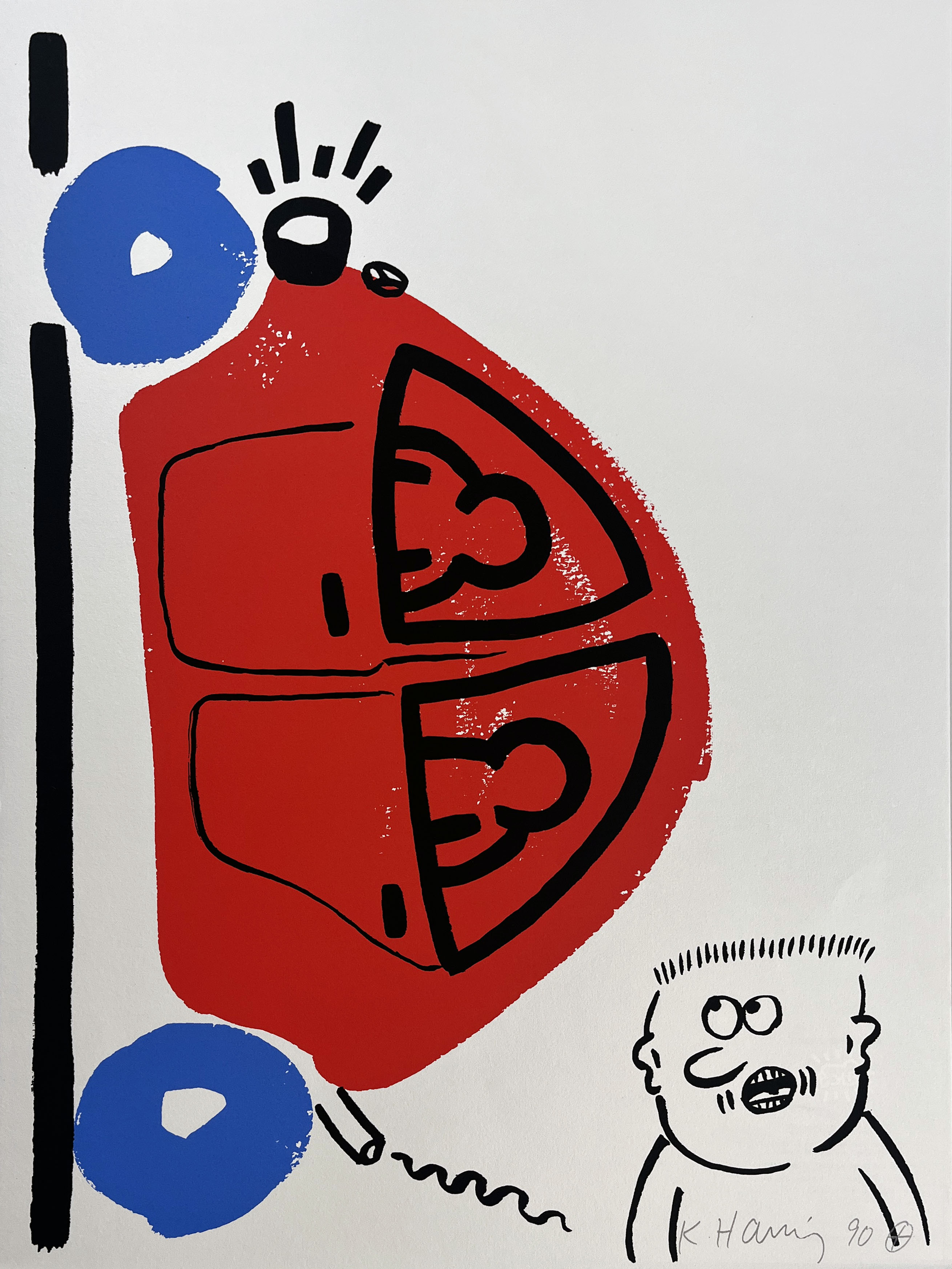 This lithograph exemplifies Haring's mastery of printmaking through bold contrasts of red and blue figures engaged in his characteristic dynamic movement. Created in the final year of his life, the work demonstrates his continued exploration of human interaction and energy through the simplified yet expressive visual language that defined his artistic legacy.
