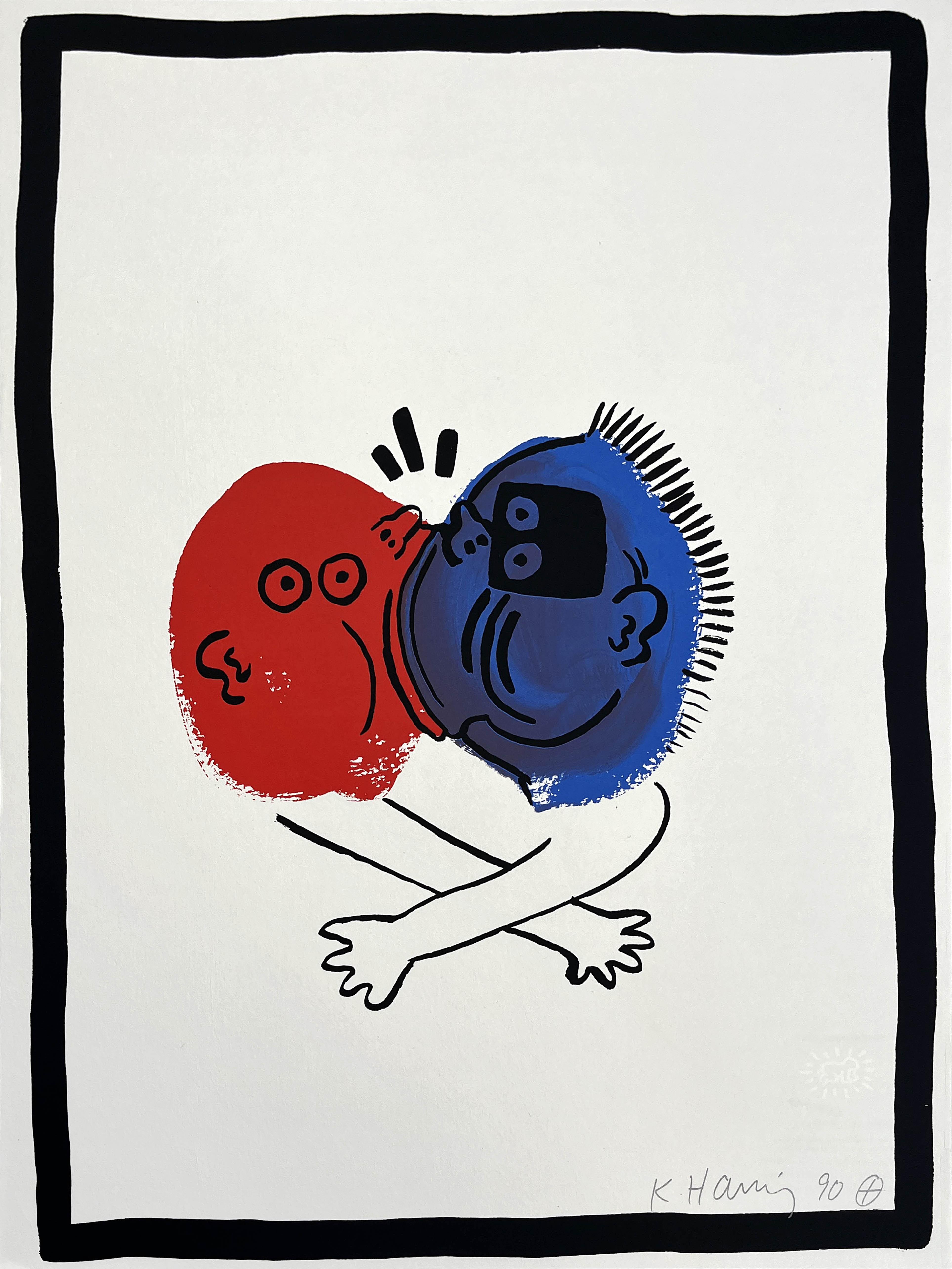 This lithograph exemplifies Haring's mastery of printmaking through bold contrasting colors and his signature animated figures in dynamic motion. Created in the final year of his life, the work demonstrates his continued exploration of narrative through simplified linear forms, with the red and blue palette creating striking visual tension within his characteristic pictographic language.