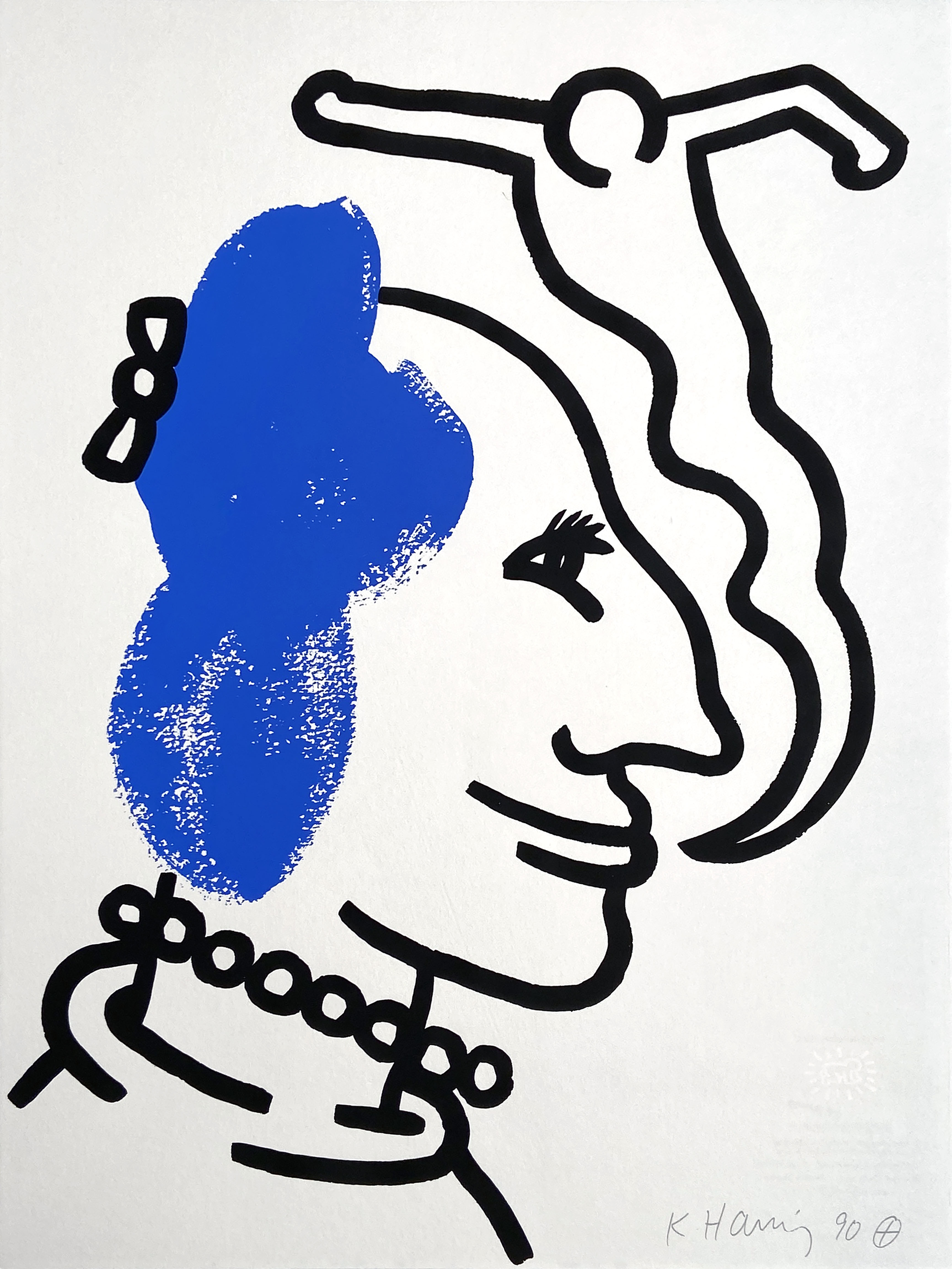 This lithograph exemplifies Haring's mastery of printmaking through bold contrasting colors and his signature dancing figures rendered in fluid, energetic lines. Part of a significant series exploring chromatic relationships, the work demonstrates the artist's ability to translate his spontaneous street art aesthetic into the refined medium of lithography during his final creative period.