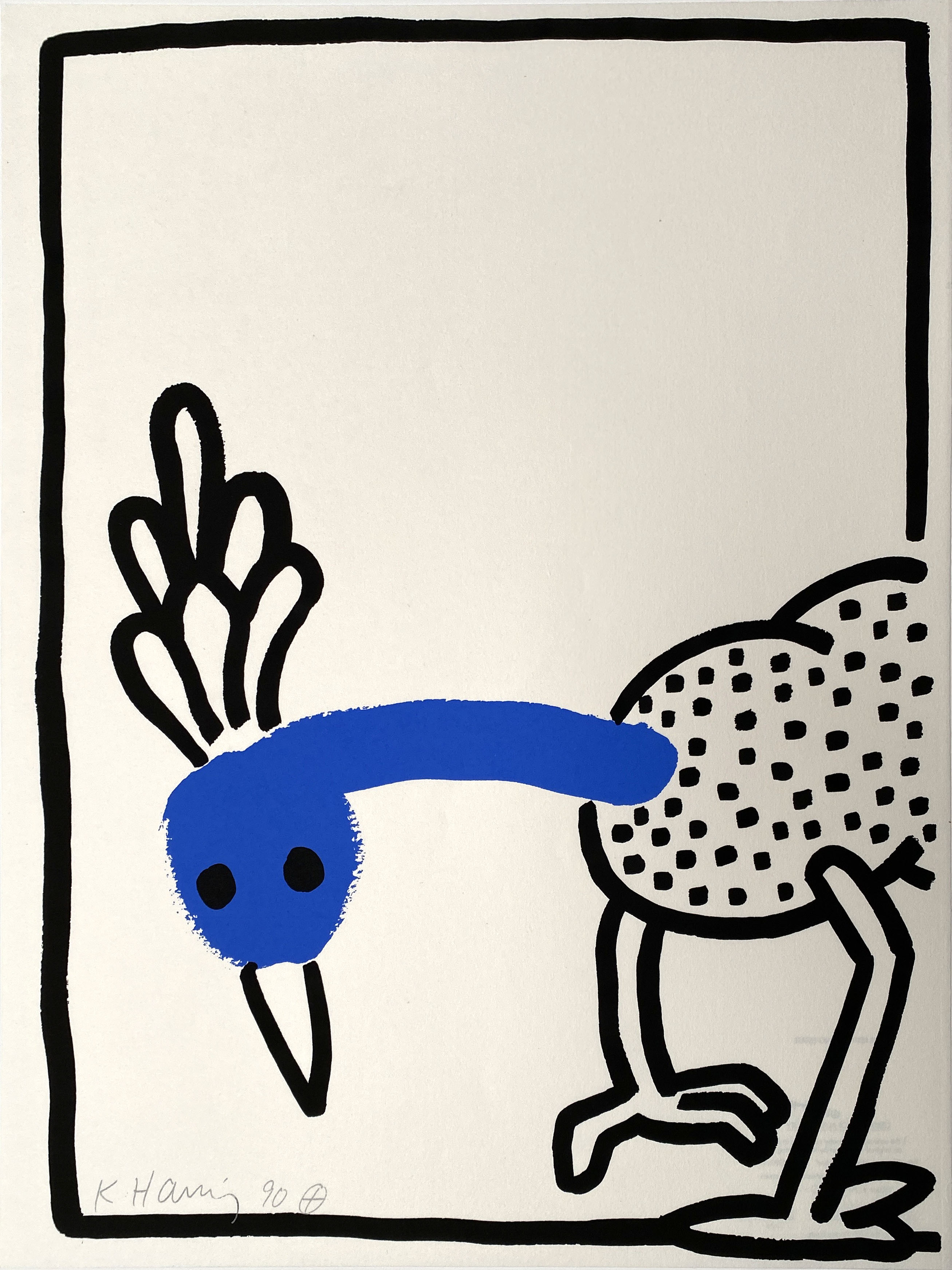 This lithograph from Haring's acclaimed "Story of Red and Blue" series demonstrates his mastery of printmaking while exploring the dynamic interplay between contrasting colors and his signature dancing figures. Created in his final productive year, the work exemplifies Haring's ability to translate his spontaneous line work into the precise medium of lithography.