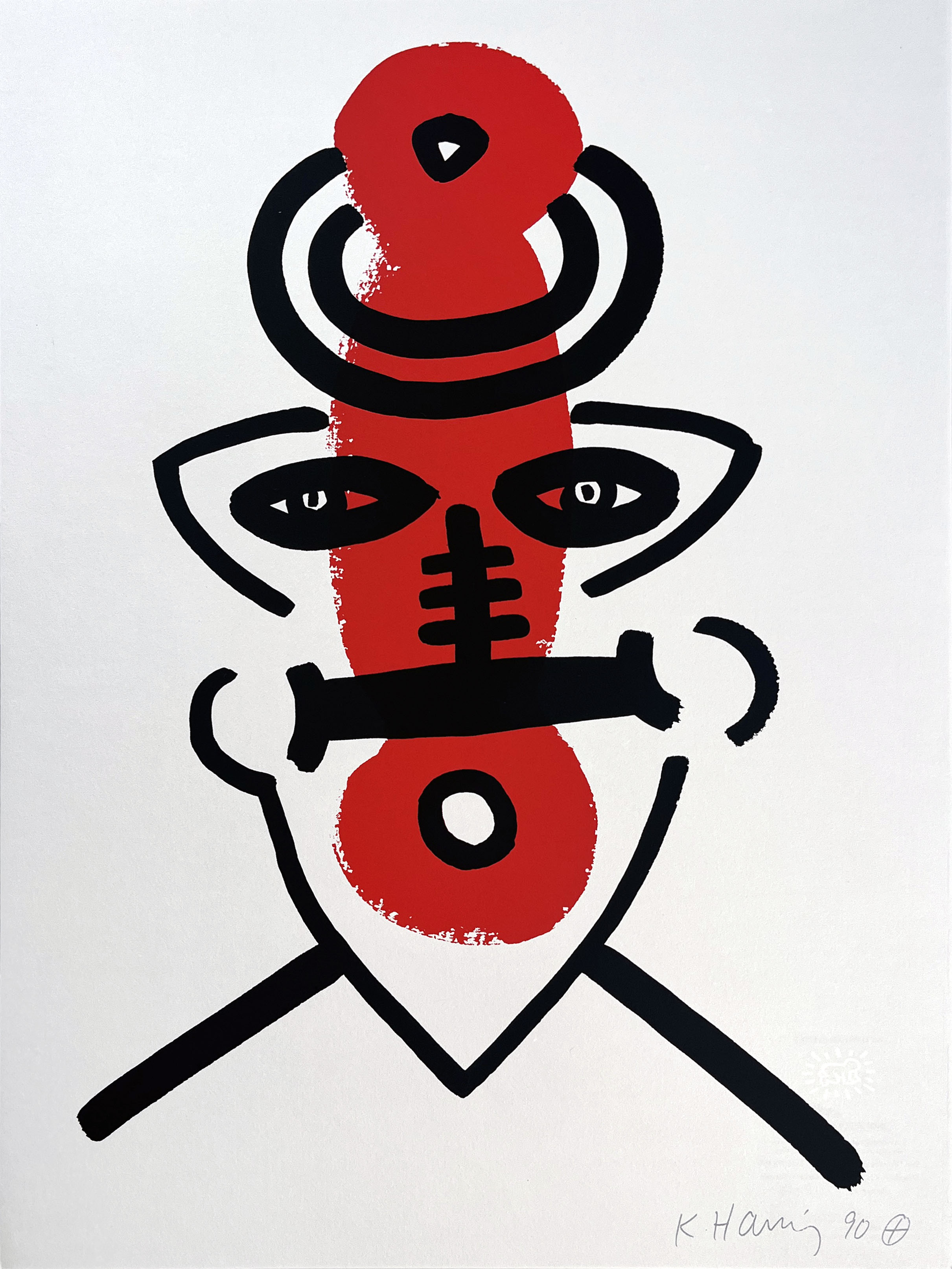 This lithograph exemplifies Haring's mastery of printmaking through bold, contrasting red and blue forms that create dynamic visual tension while maintaining his signature linear energy. Part of a numbered series exploring color relationships, the work demonstrates the artist's evolution from street art origins to sophisticated print techniques during his final creative period.