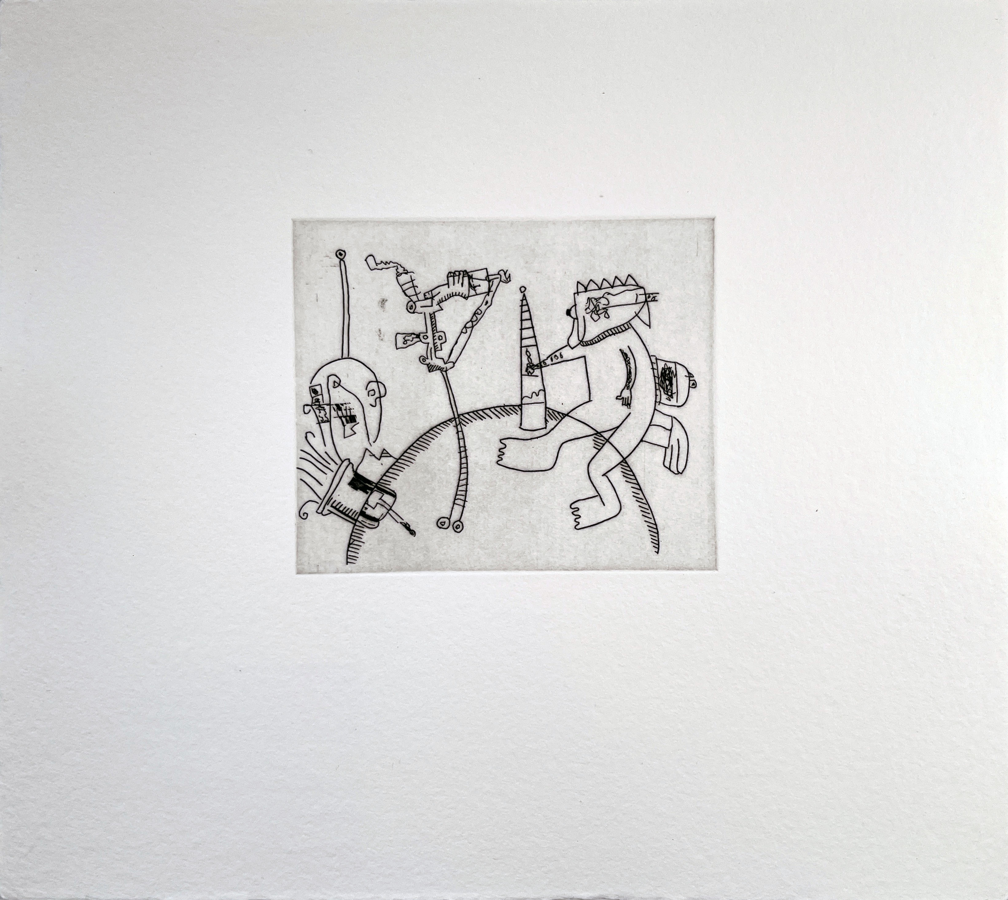 This 1989 etching represents a rare collaborative work between Haring and Sean Kalish, created during the final period of the artist's career. The limited edition of 33 demonstrates Haring's exploration of traditional printmaking techniques while maintaining his signature bold linear style and dynamic figurative vocabulary.