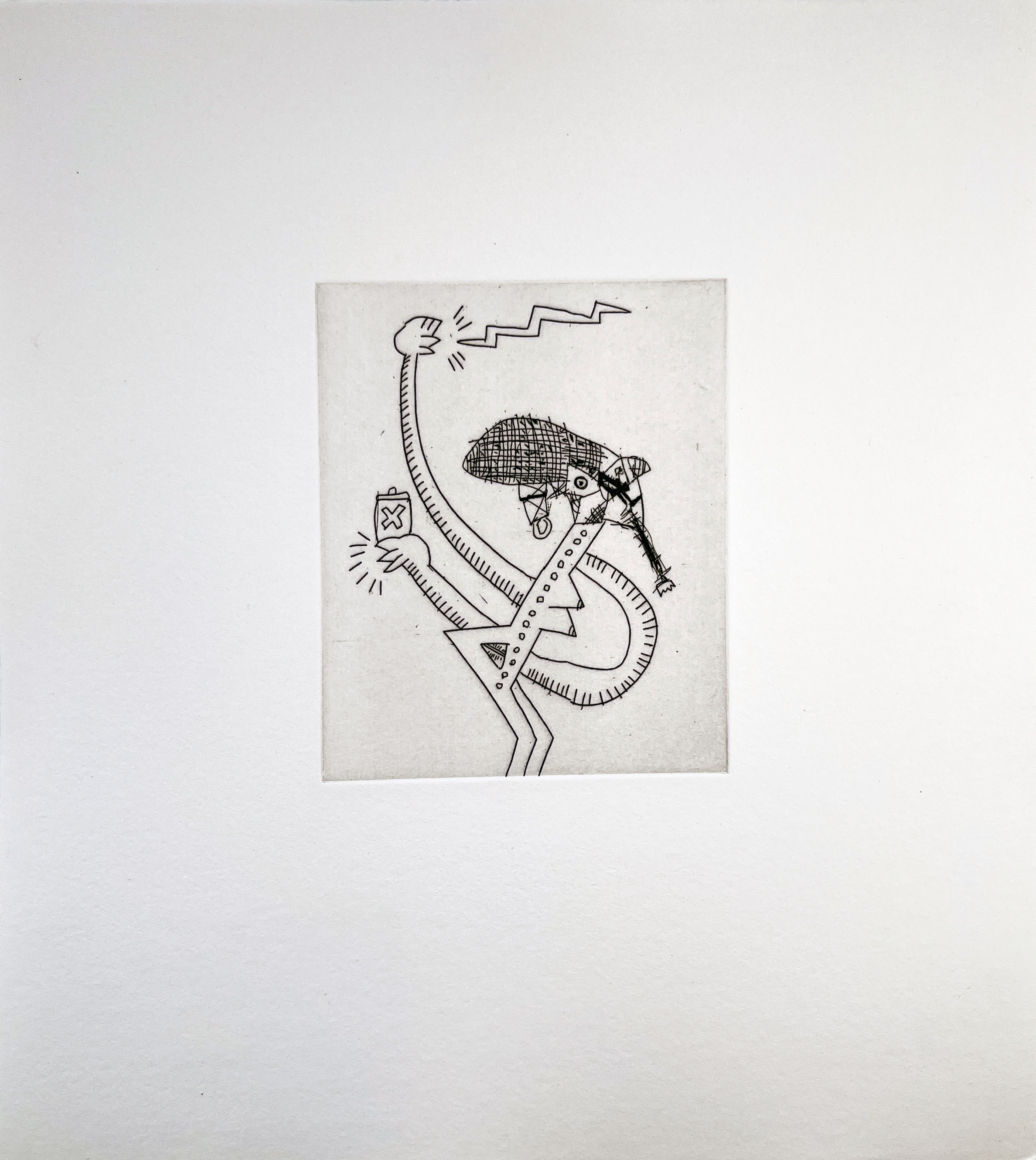 This collaborative etching demonstrates Haring's continued exploration of printmaking techniques in his final creative period, working alongside Sean Kalish to produce a limited series that maintains his signature bold linear style while experimenting with the rich tonal possibilities of the etching medium.