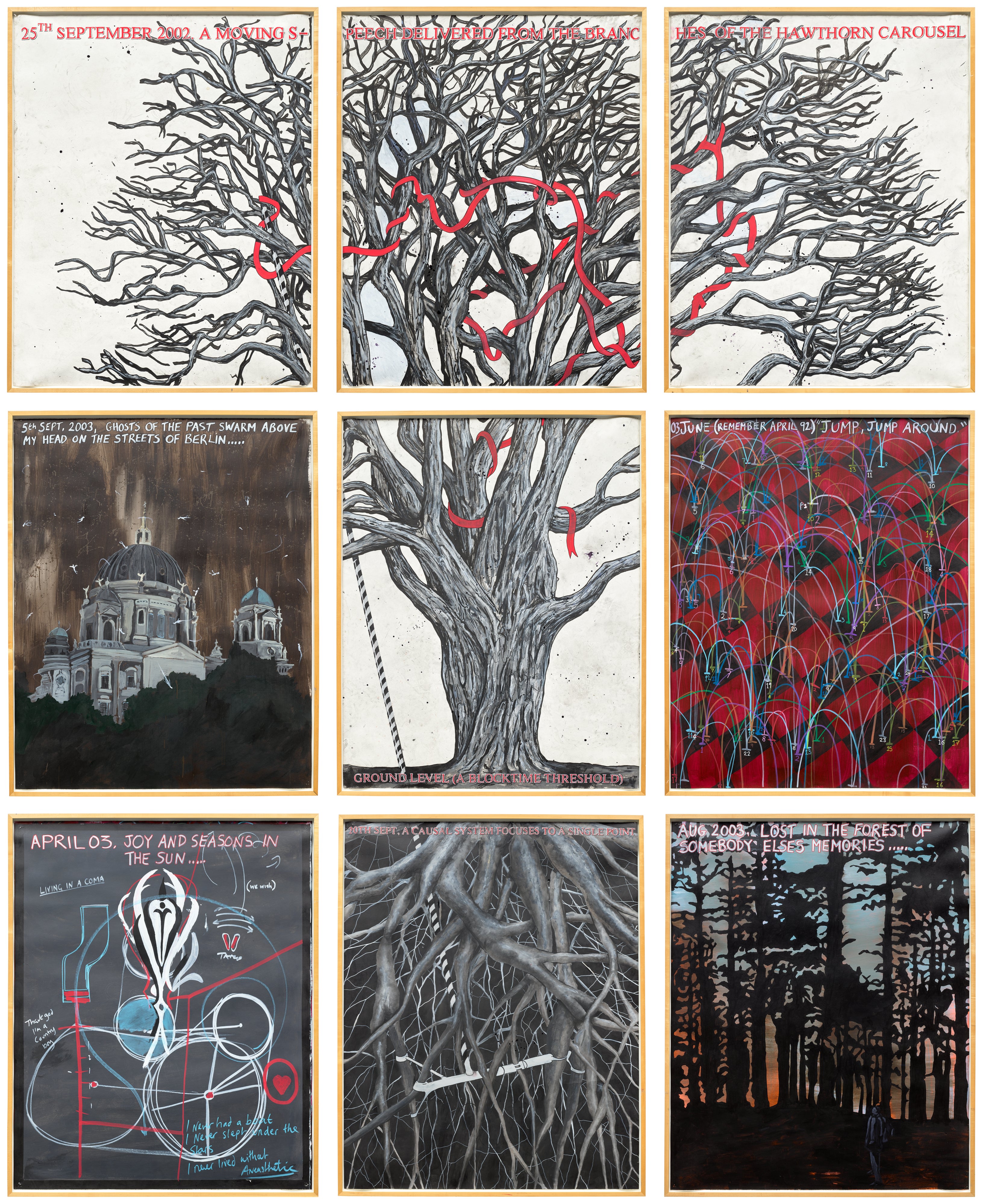 A monumental work composed of nine individual panels, this piece by Keith Tyson combines watercolour, ink, and acrylic on paper to create a sprawling, encyclopaedic meditation on a single day. The work reflects Tyson's characteristic impulse to map the interconnected systems, events, and ideas that converge at any given moment in time, blending diagrammatic notation with expressive mark-making. Presented in the artist's own frame, the piece is as much an object as it is an image, emphasising Tyson's interest in the artwork as a living document of the world.