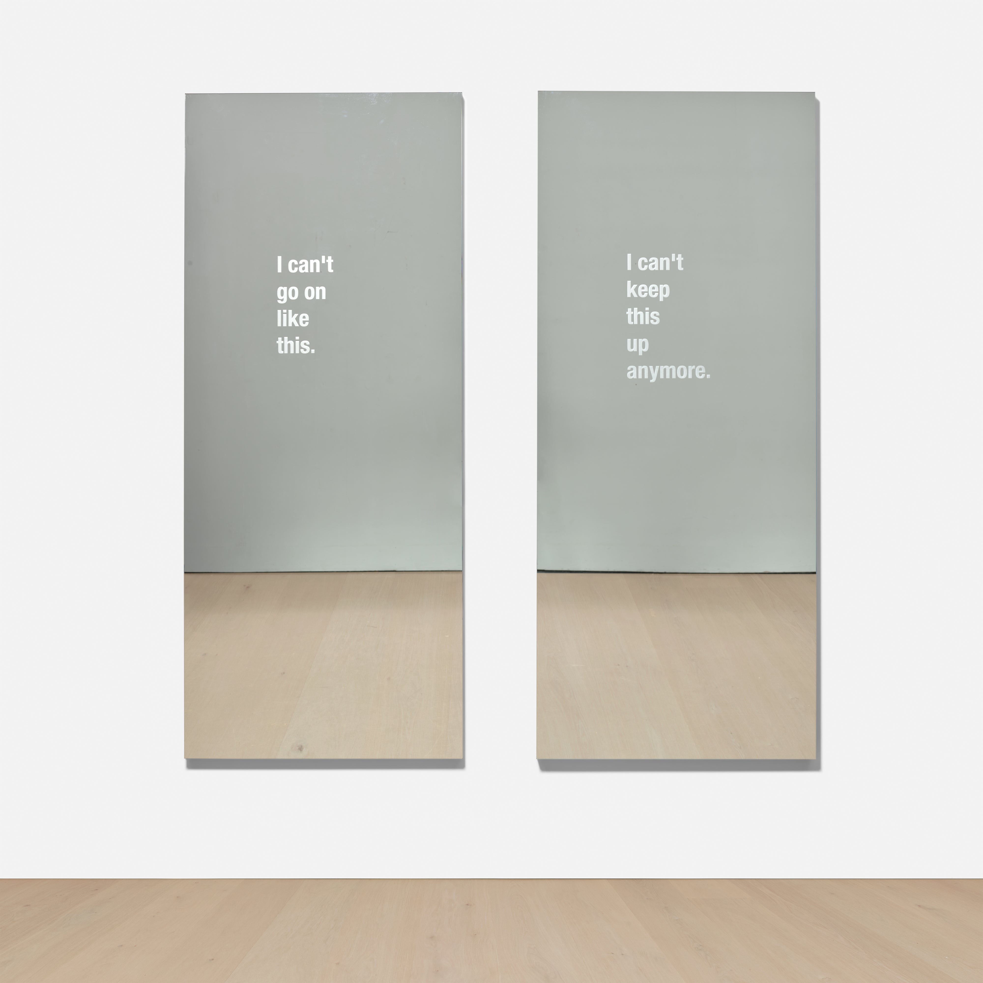 Ken Lum's *Mirror-Diptychon* (2004) is a two-part work composed of vinyl text applied to mirrored surfaces mounted to acrylic on aluminium. The use of reflective material implicates the viewer directly within the piece, collapsing the boundary between subject and observer. Lum's characteristic engagement with language, identity, and social tension is embedded in the work's material form, where text and reflection operate simultaneously as message and medium.