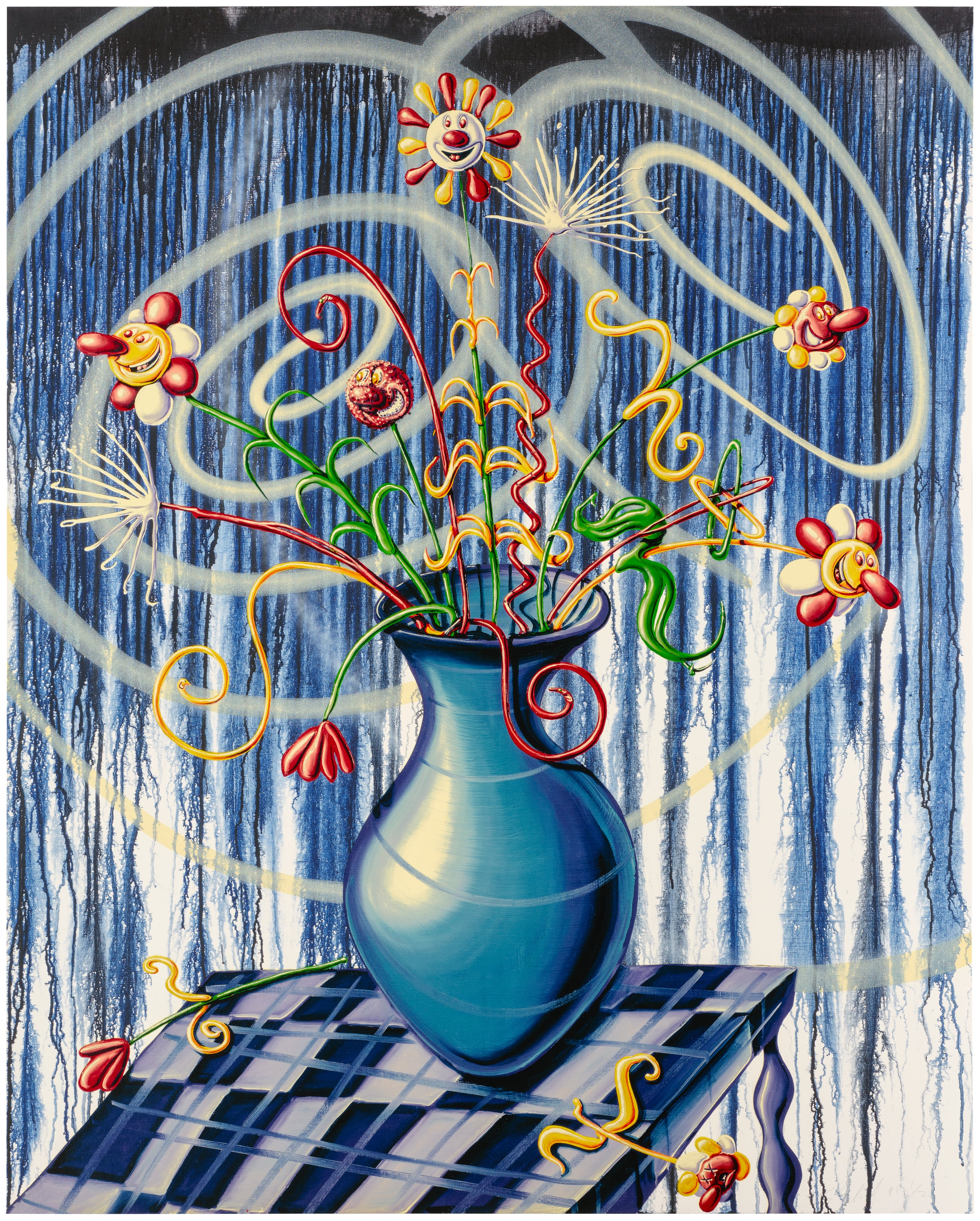 Kenny Scharf's *Big Flores Blue* is a vibrant archival pigment print bursting with the artist's signature psychedelic aesthetic, featuring bold, cartoonish forms rendered in rich, saturated hues. The work is enhanced with screenprinted high gloss varnish and diamond dust, adding a shimmering, tactile dimension that catches the light and amplifies its sense of fantastical energy. Printed on Innova Etching Cotton Rag paper, the full sheet showcases Scharf's playful fusion of pop culture, cosmic imagery, and street art influences.