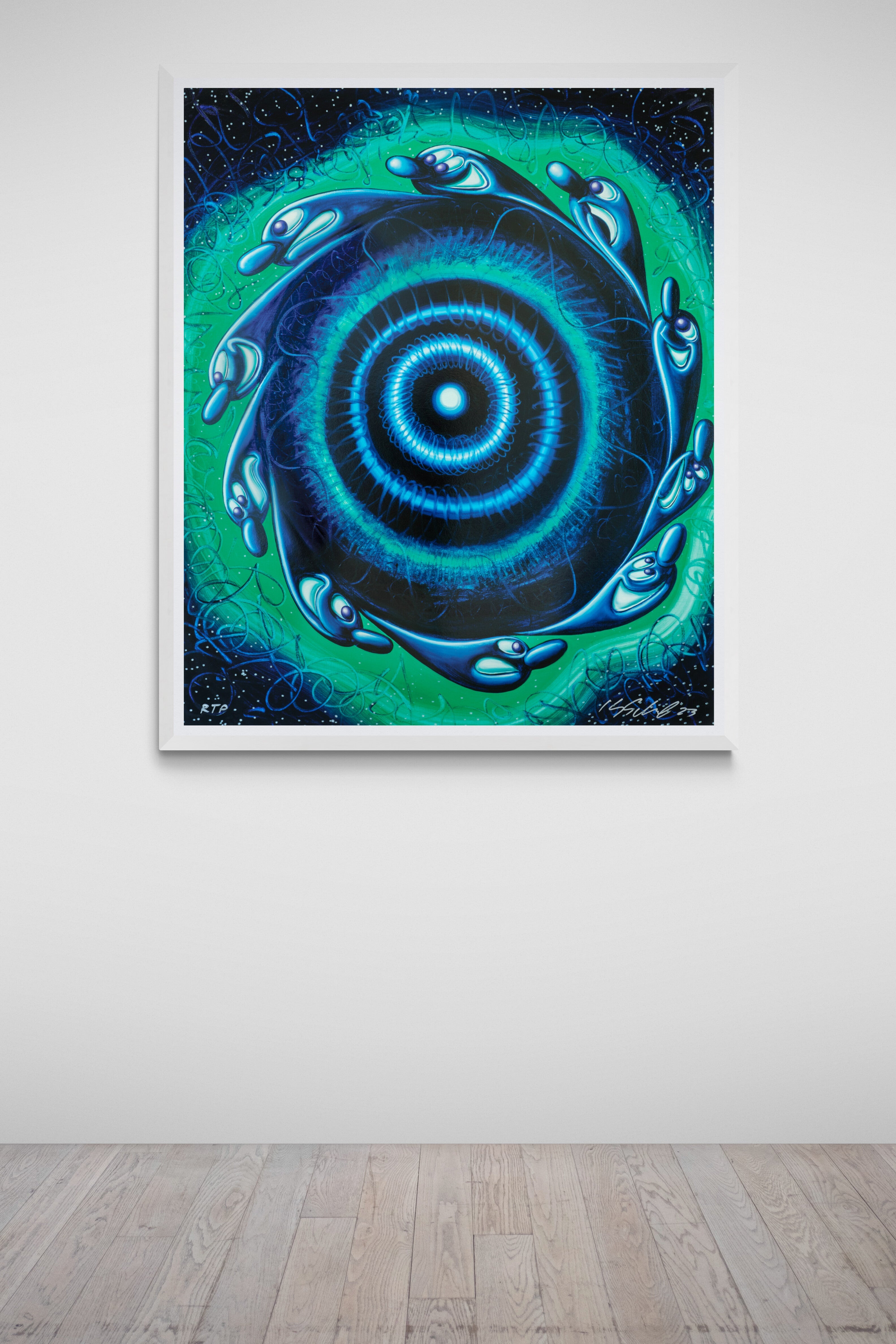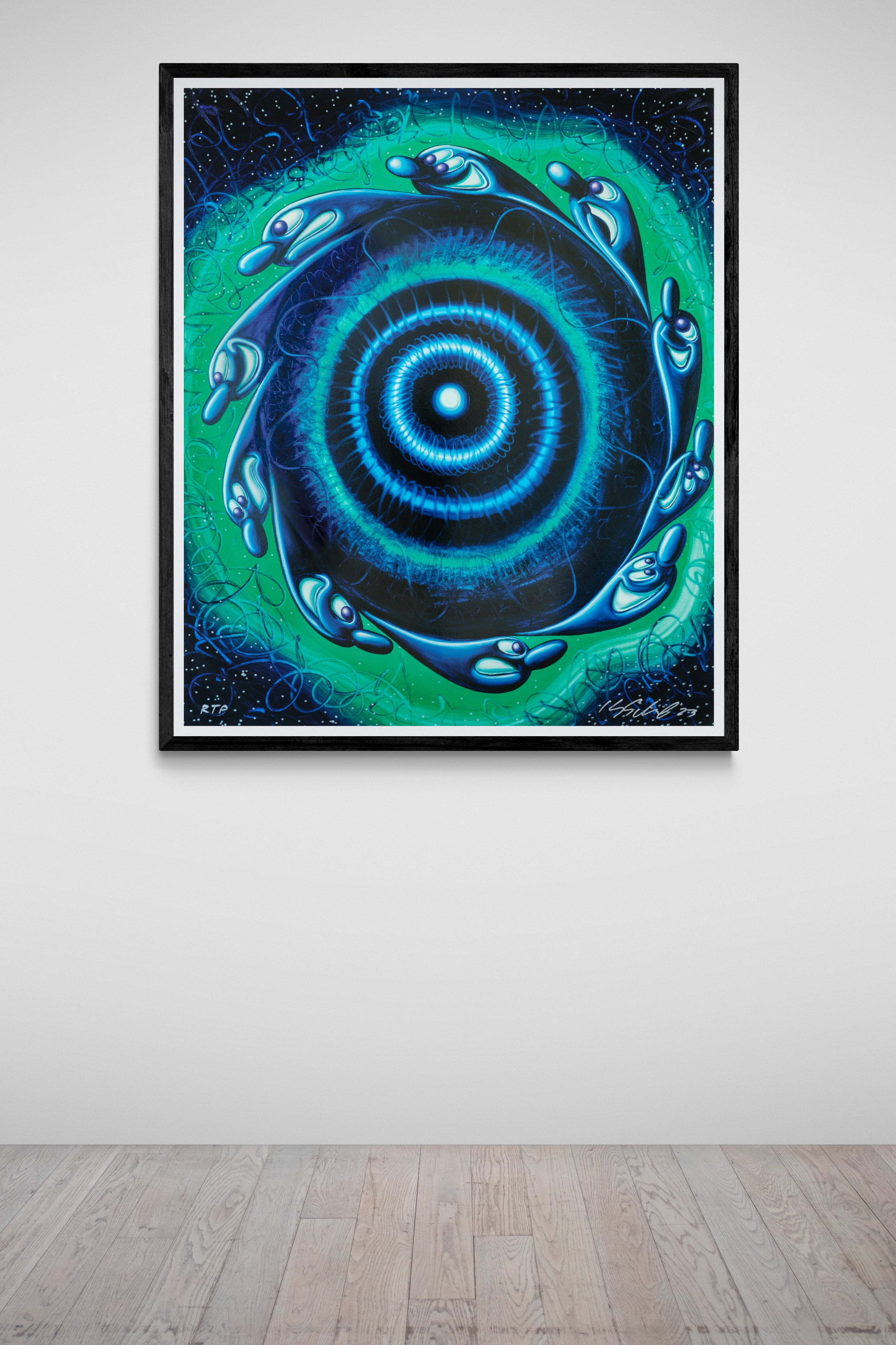 Starget represents Kenny Scharf's signature visual language of gestural abstraction and playful mark-making, rendered through a sophisticated multimedia approach that elevates the work into a luminous, dimensional object. Created in 2023, this archival pigment ink print is enhanced with silkscreened high gloss varnish and diamond dust, transforming the surface into something that captures and reflects light while maintaining the raw energy of Scharf's intuitive drawing style. The interplay between the matte fine art paper and the glossy, sparkling applications creates a dynamic visual experience that shifts depending on the viewer's position and the surrounding light conditions, inviting prolonged engagement with the composition. This edition of 40 demonstrates Scharf's commitment to creating accessible yet refined works that maintain the spontaneity and vitality central to his practice since the 1980s. The substantial dimensions of 50.5 by 42 inches command attention on the wall, while the technical precision of the production process contrasts beautifully with the intuitive nature of the imagery itself. The addition of diamond dust elevates this beyond a standard print into a luxury object, appealing to collectors who appreciate both the conceptual rigor behind Scharf's practice and the tactile, experiential qualities that define contemporary fine art production.