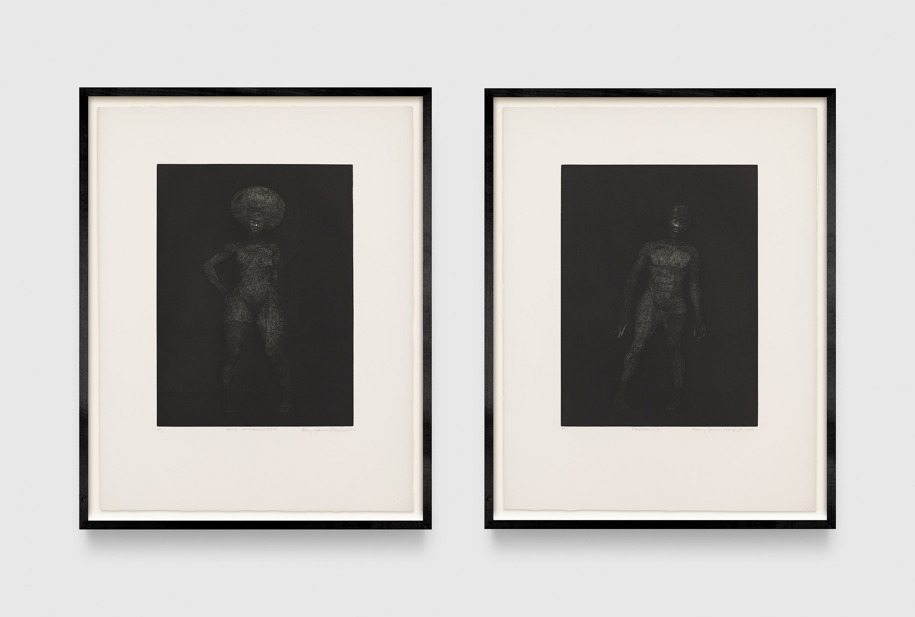 A two-part hardground etching with aquatint depicting characters from the Frankenstein narrative, exploring themes of monstrosity and identity. The work uses printmaking techniques to create contrasting tonal values and dramatic imagery.
