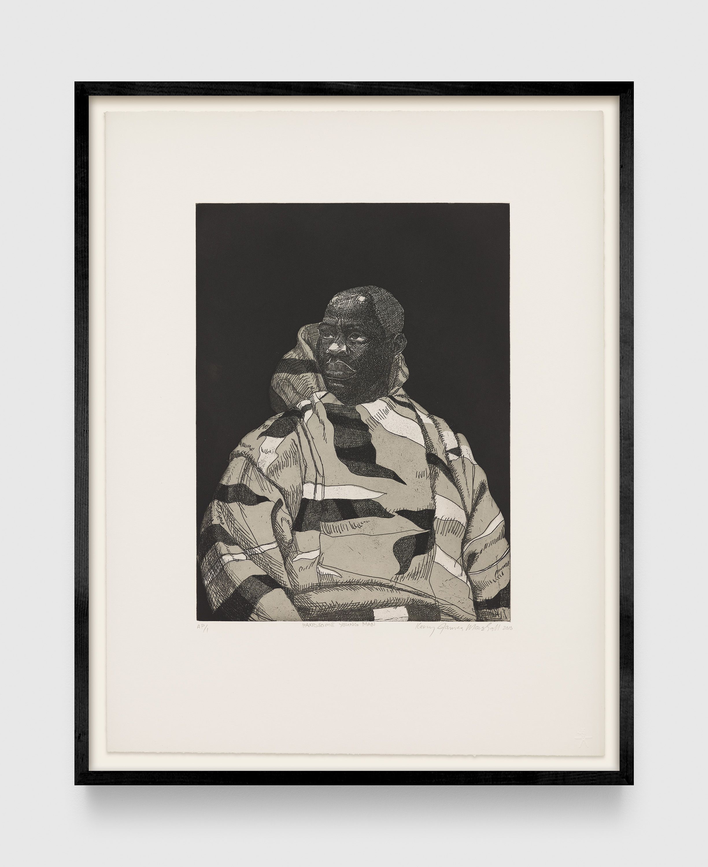 A hardground etching with aquatint portraying a male figure rendered with strong contrasts and geometric elements. The work exemplifies Marshall's distinctive approach to figuration and abstraction.