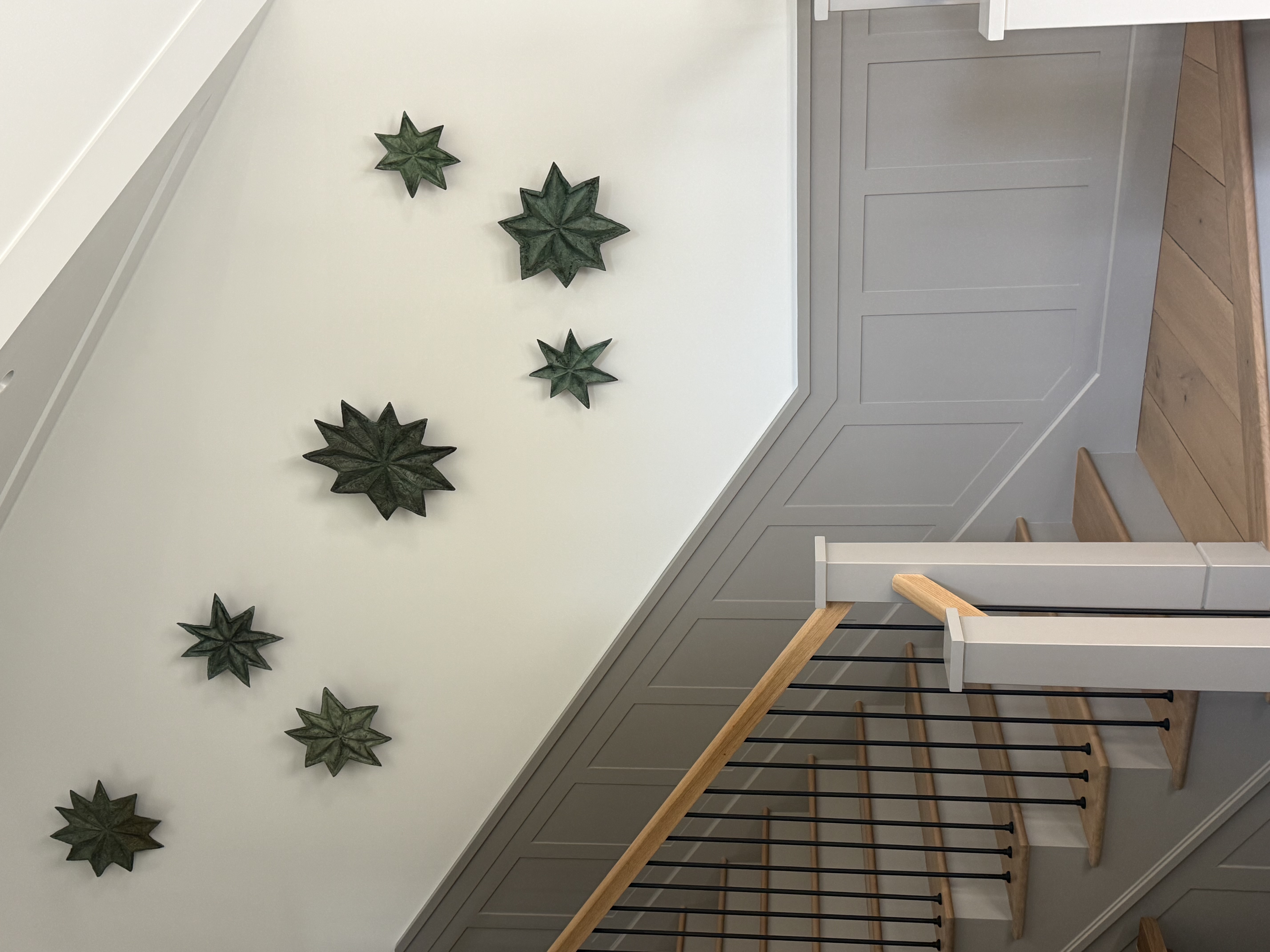 Northern Sky is a compelling sculptural installation by Kiki Smith consisting of seven bronze star forms arranged in a celestial configuration. The stars vary in size, with dimensions ranging from the largest at 22 × 18 3/4 × 4 inches to the smallest at 10 1/2 × 11 × 2 3/4 inches. The patinated bronze surfaces display rich green tones, creating a contemplative interplay between the natural materiality of metal and the cosmic symbolism of stellar forms.