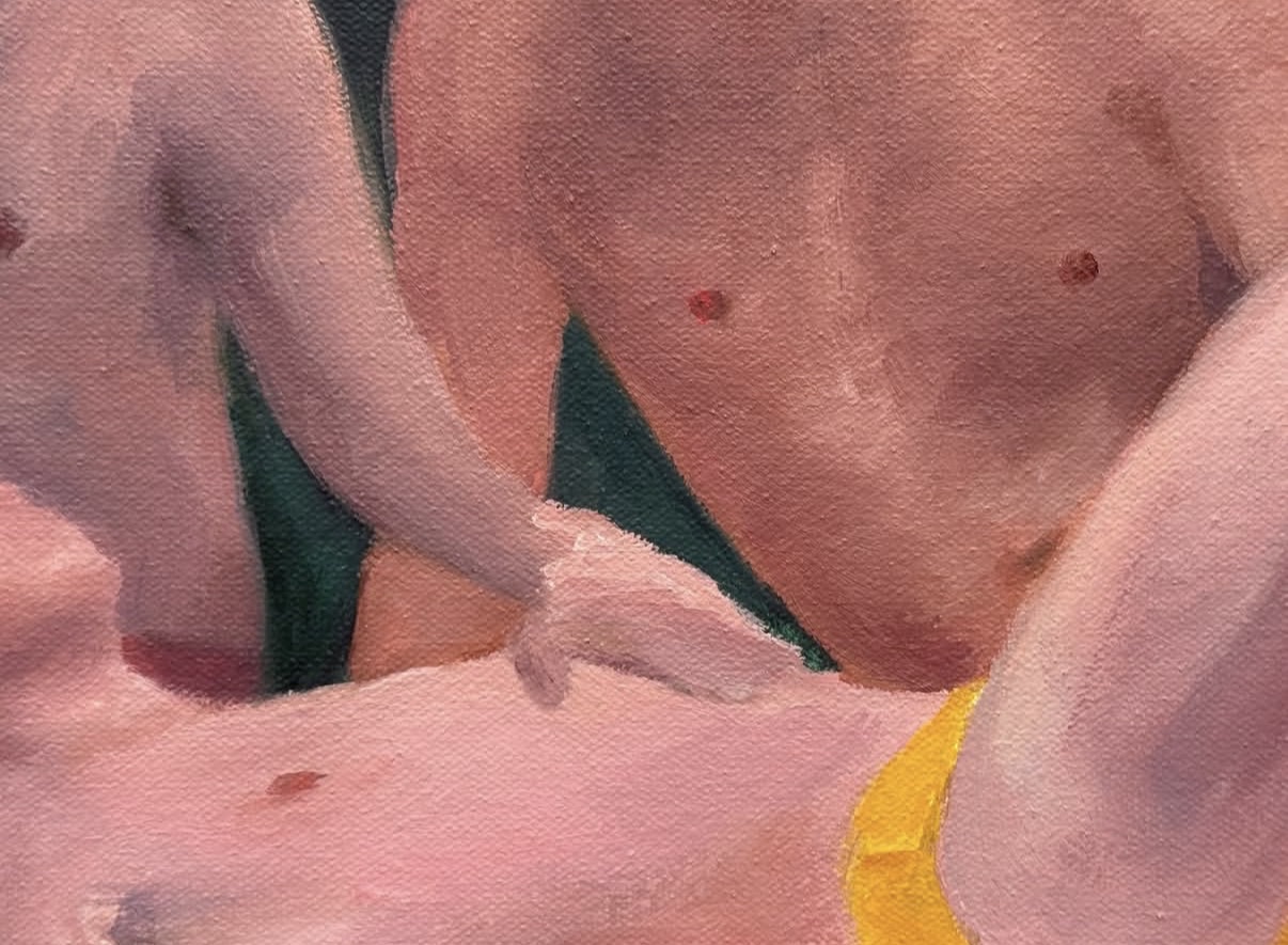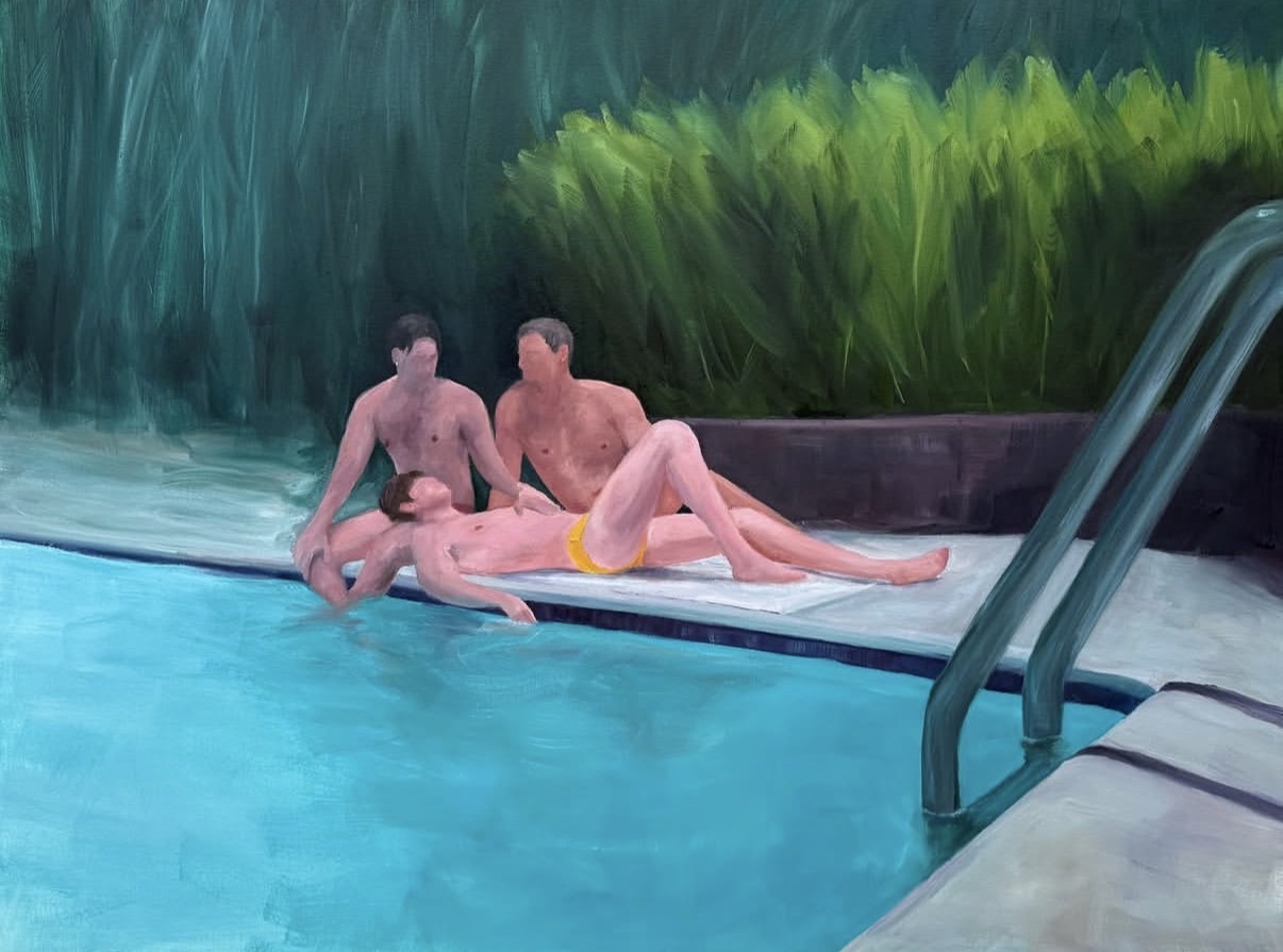 This evocative poolside scene depicts three figures in an intimate moment by a turquoise swimming pool, surrounded by lush tropical foliage. Alexander's expressive brushwork and minimalistic color palette create a dream-like atmosphere characteristic of his queer narrative works. The painting exemplifies his contemporary realist approach, balancing enigmatic ambiguity with romantic, memory-like imagery that invites viewer interpretation.