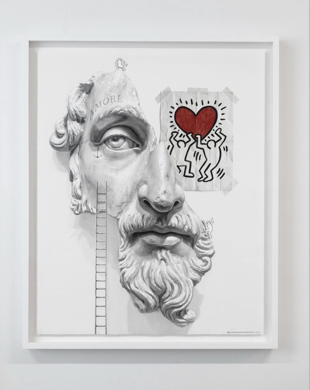 This striking mixed media work by Kozo fuses a hyper-realistic rendering of a fragmented classical male bust with contemporary pop culture iconography. The forehead of the figure bears the word AMORE alongside an anchor motif, both rendered in Kozo's signature tattooed style, while a Keith Haring inspired heart poster taped to the composition introduces a bold red accent against an otherwise monochromatic palette. Whimsical climbing figures ascend a ladder along the side of the face, reinforcing Kozo's playful yet deeply considered dialogue between classical antiquity and modern visual culture. A compelling collector piece for those drawn to works that bridge tattoo artistry, figurative painting, and street art influence.