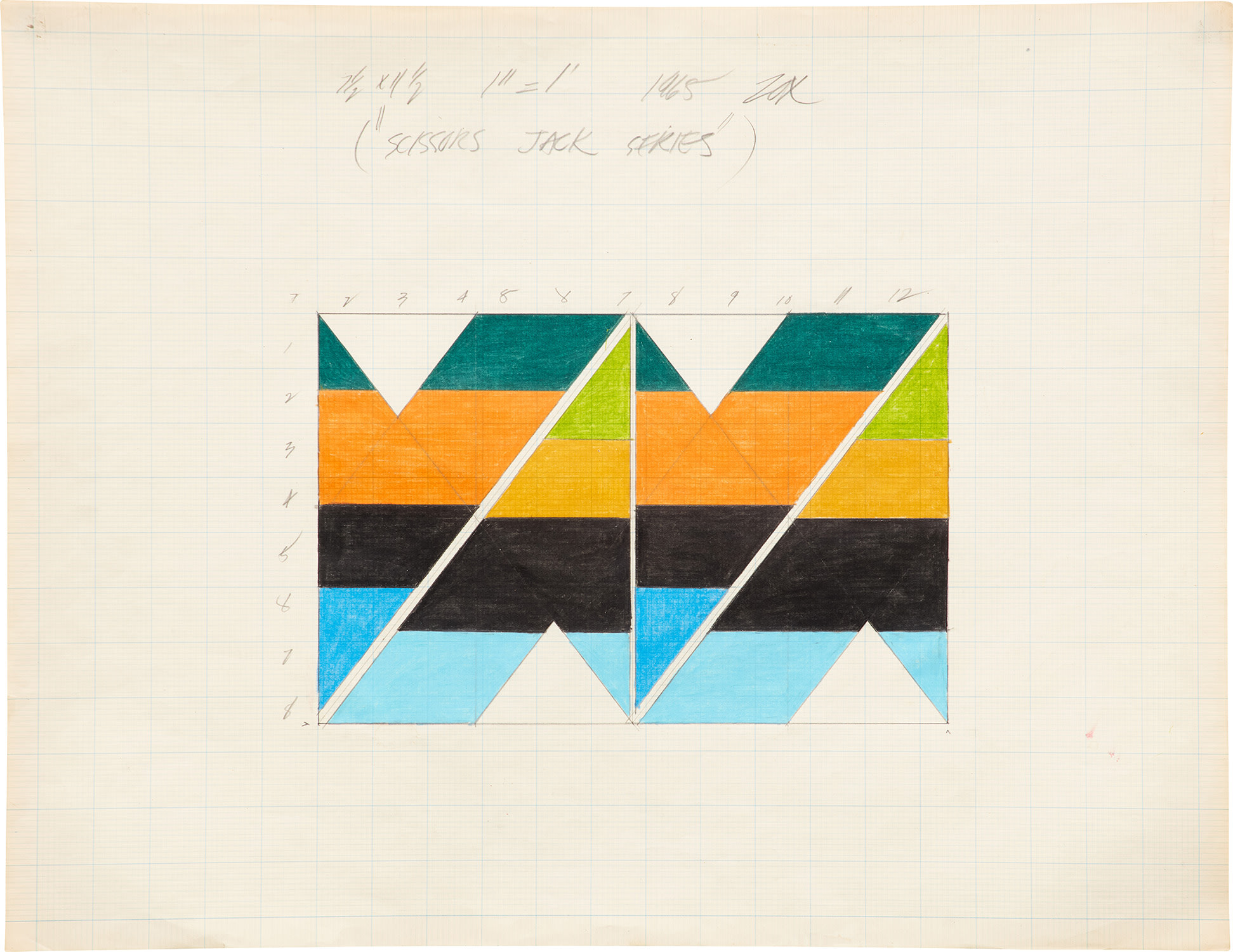 Preparatory graphite and colored pencil studies on graph paper exploring geometric compositions for the Scissors Jack series. These working drawings reveal the artist's conceptual process.