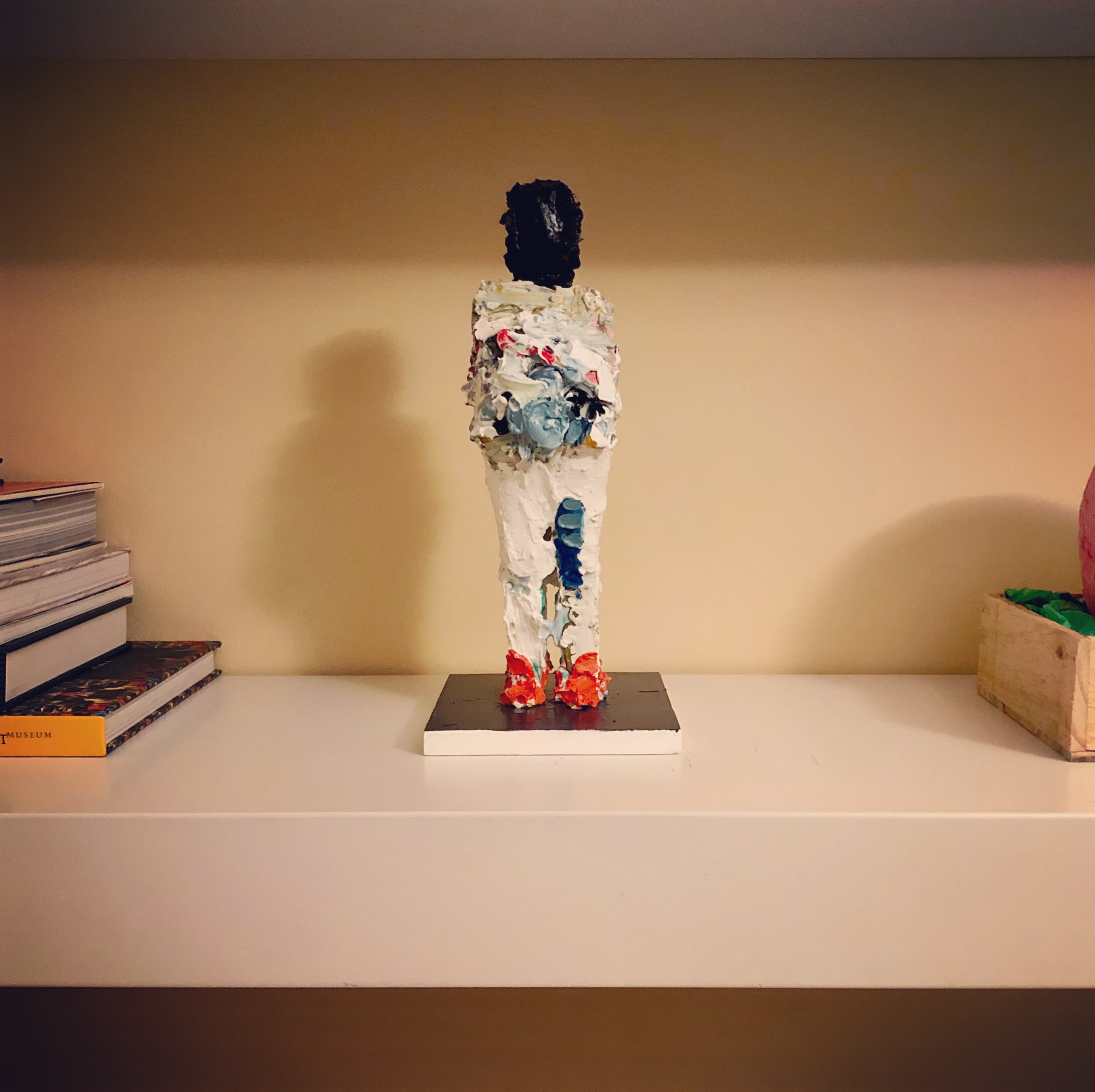 A contemporary figurative sculpture depicting a standing human form rendered in thick, impasto-like applications of paint and mixed media. The figure features a dark blue-black head, predominantly white body with expressive gestural marks in blues and grays, and vibrant orange-red feet on a dark base. The heavily textured surface and abstracted form demonstrate Jenkins' signature approach to materiality and the human figure.