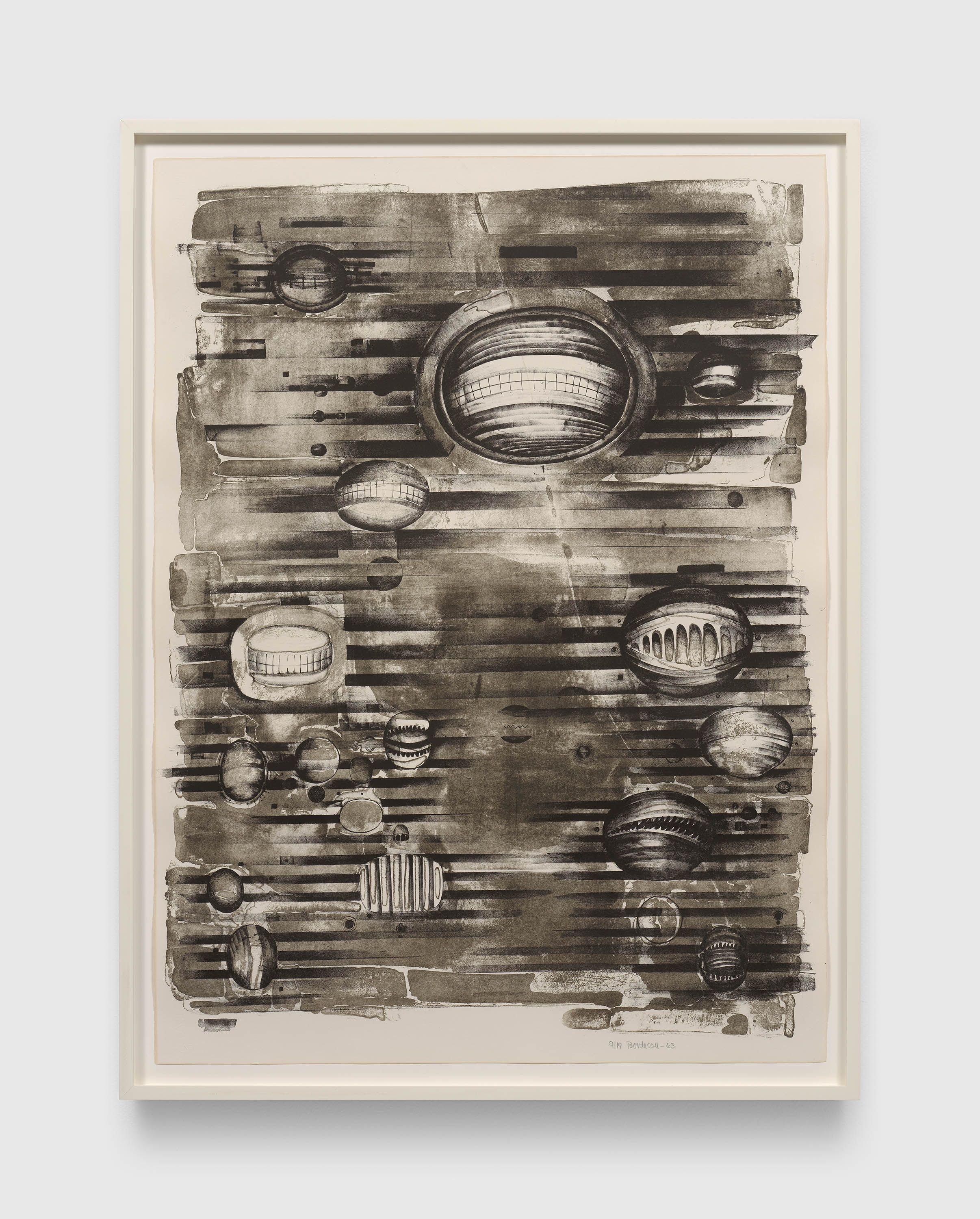 A lithograph created by Bontecou, known for her abstract sculptural and graphic works. The piece demonstrates her exploration of form and space through printmaking techniques.