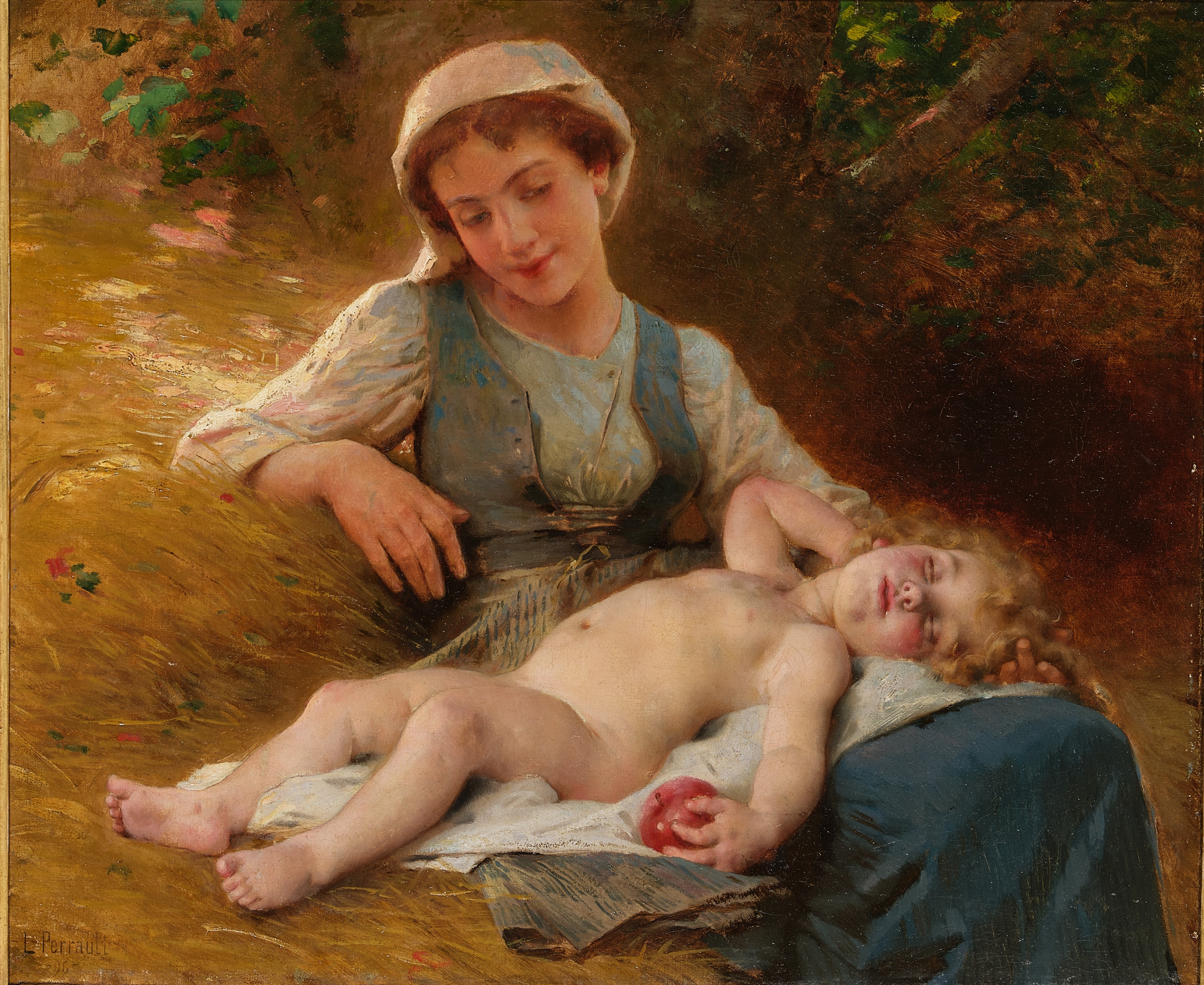 Léon-Jean-Basile Perrault's 'Fast Asleep' captures a moment of restful slumber in oil on canvas. The work likely explores themes of sleep, peace, or domestic intimacy.