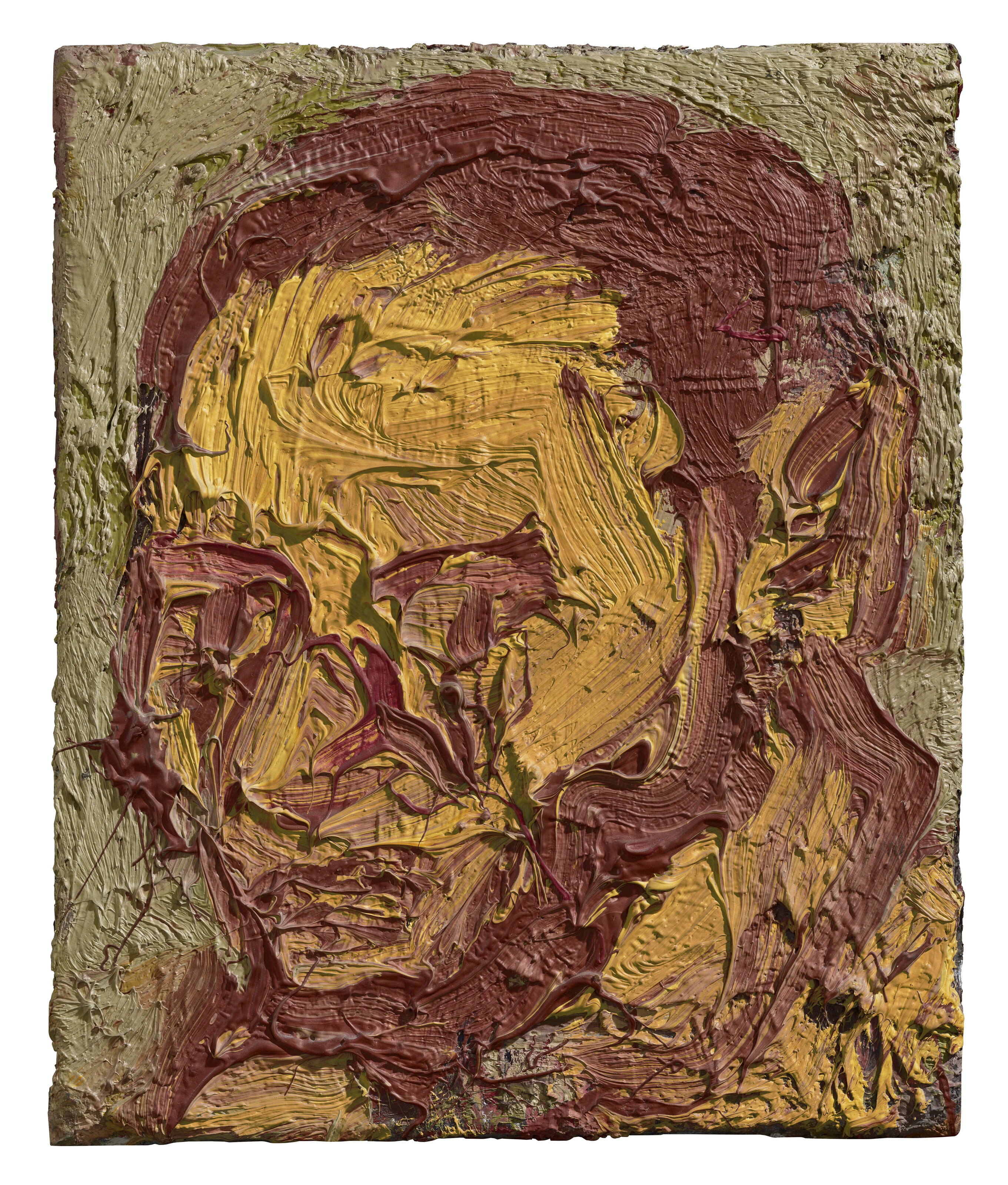Leon Kossoff's "Self Portrait" exemplifies the artist's distinctive approach to figuration, employing thick, gestural brushwork and a heavily worked surface that conveys both physical presence and psychological intensity. The painting demonstrates Kossoff's characteristic expressionistic style, which emerged from his engagement with the School of London movement, prioritizing direct observation and emotional authenticity over formal perfection. Through layered impasto and a muted, earthy palette, Kossoff creates a compelling representation that reflects his interest in capturing the immediacy of lived experience and human presence.
