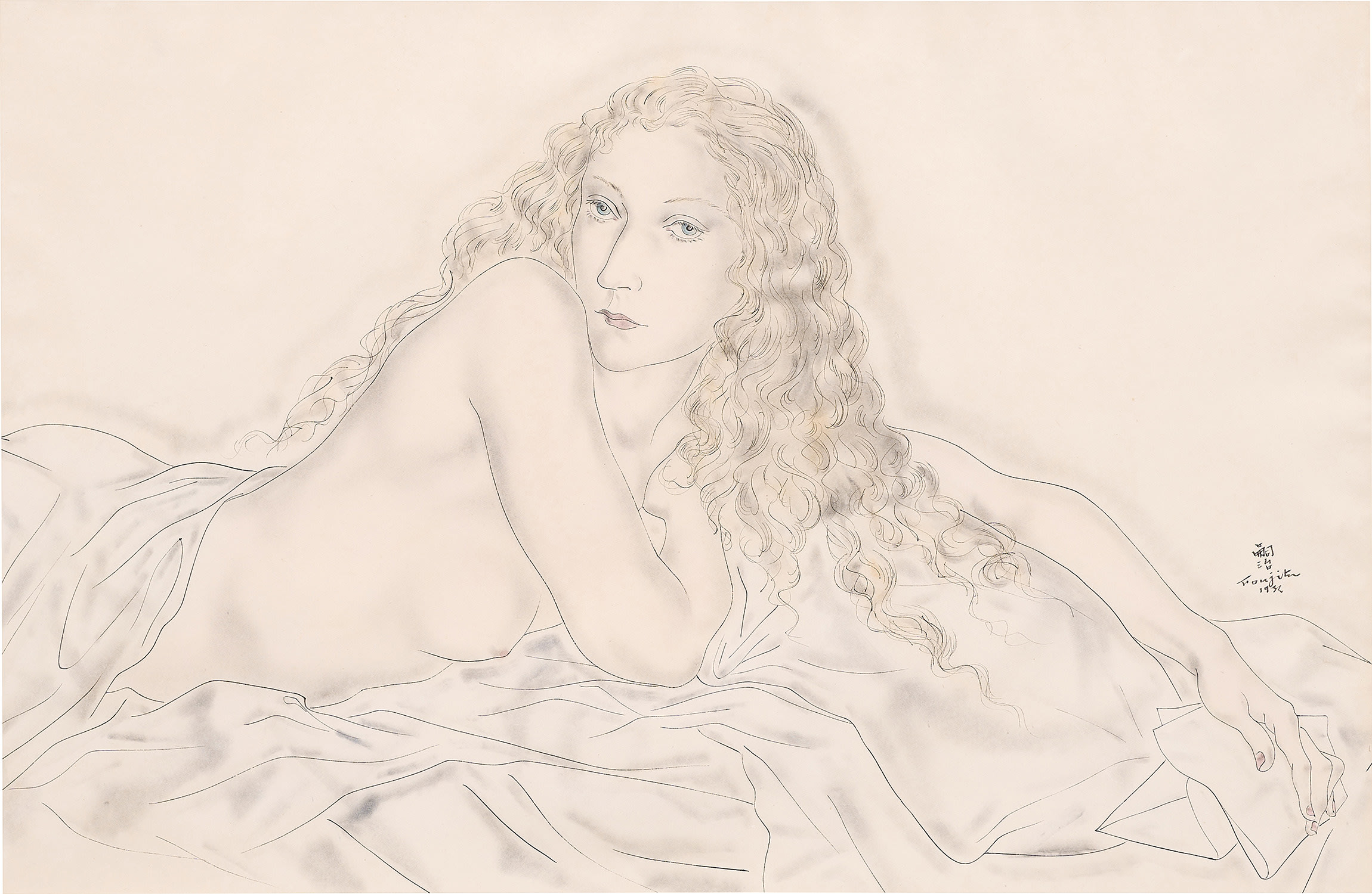 Léonard-Tsuguharu Foujita's 'Nu allongé' (Reclining Nude) from 1932 is executed in watercolor and ink on paper. The work demonstrates Foujita's elegant fusion of Western and Japanese artistic traditions.