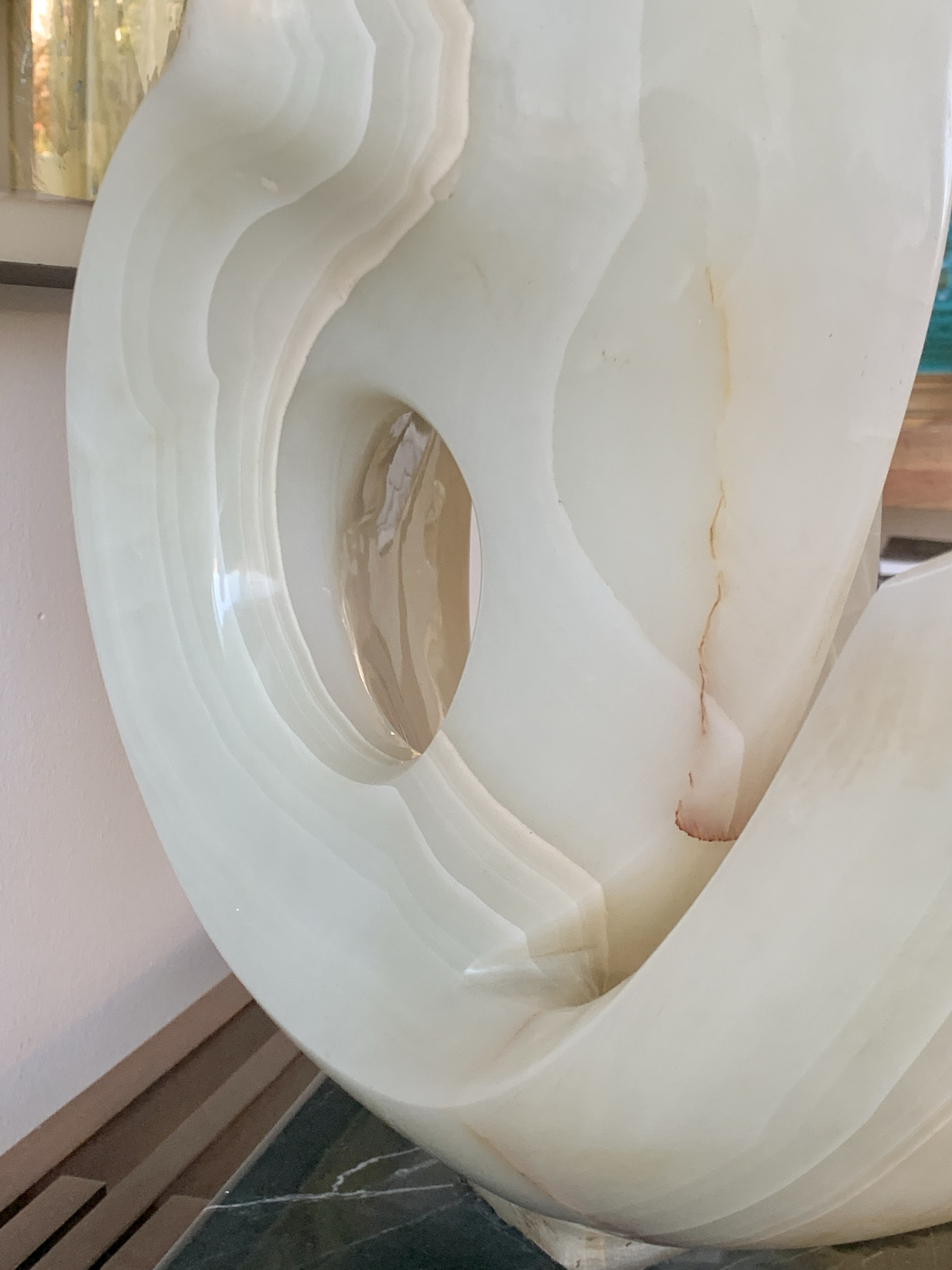 Hepworth carved abstract biomorphic forms directly from stone and marble, emphasizing the material's natural beauty and translucence while achieving fluid organic shapes that closely parallel the twisting sculptural language Nierman employs in polished onyx.