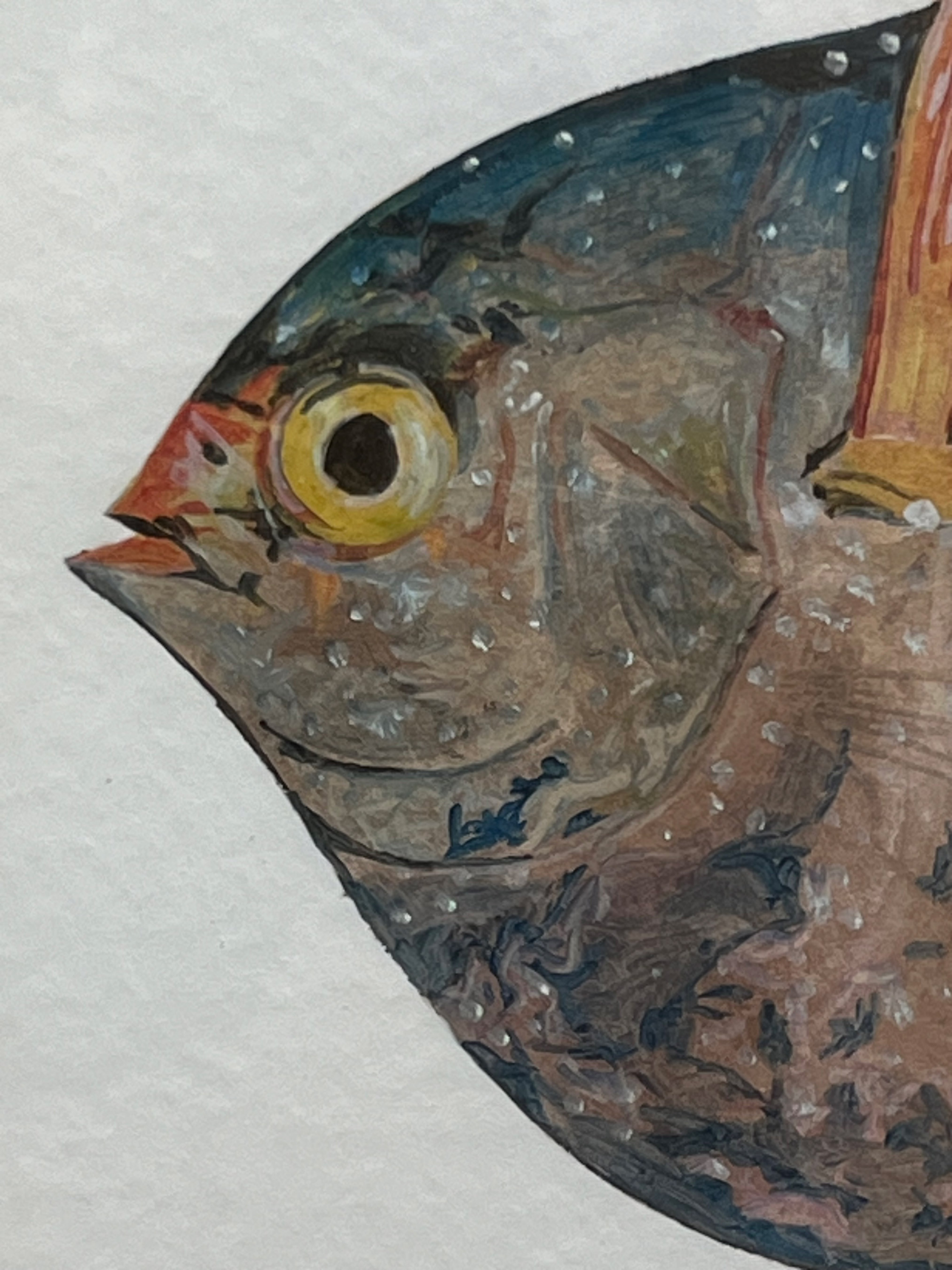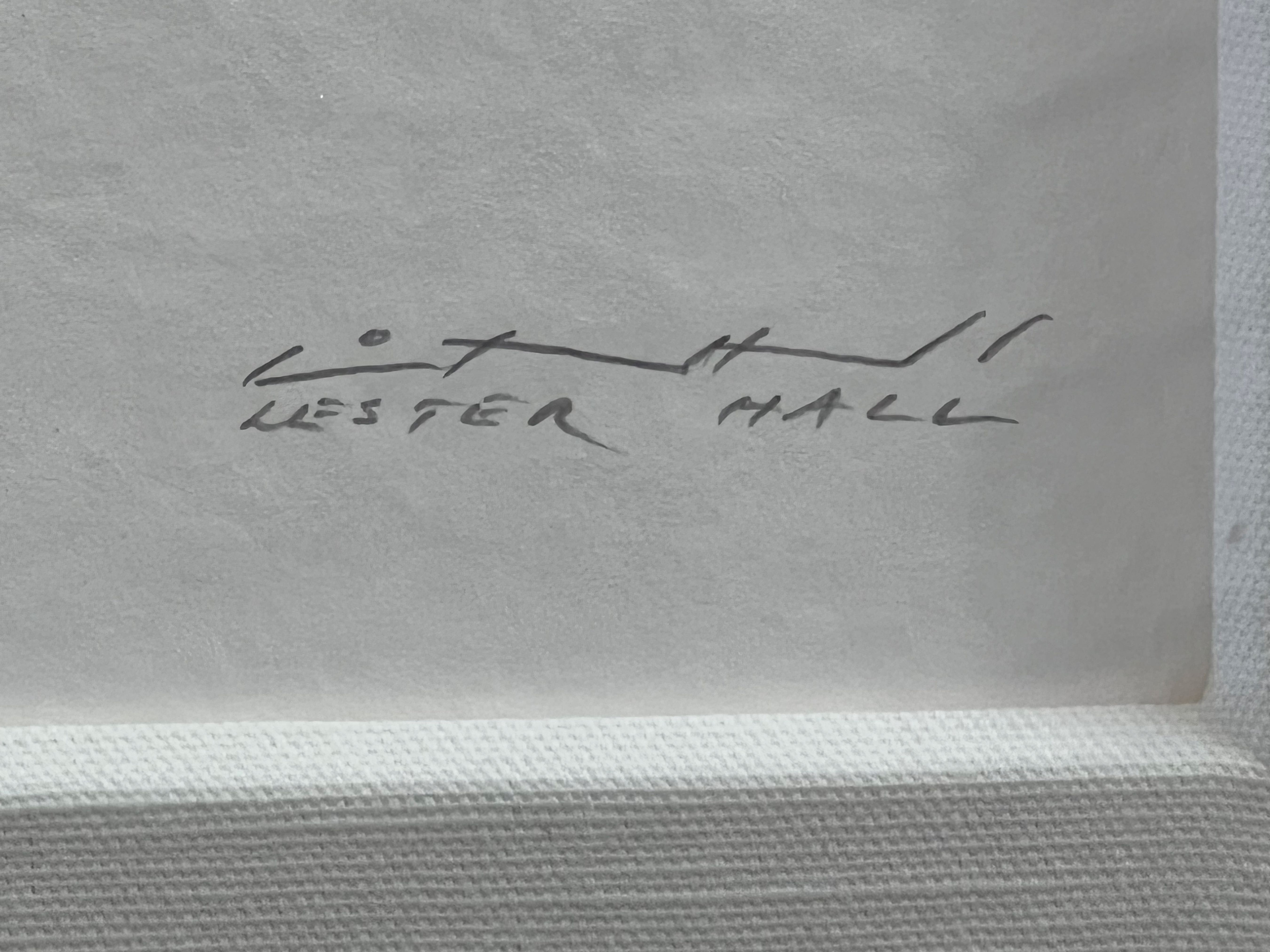 This work by New Zealand artist Lester Hall features a detailed depiction of an opah, commonly known as a moonfish. The fish is rendered with rich texture and color against a stark, clean background, a characteristic of Hall's style which blends natural history illustration with a contemporary aesthetic. The piece is titled and signed by the artist at the bottom.