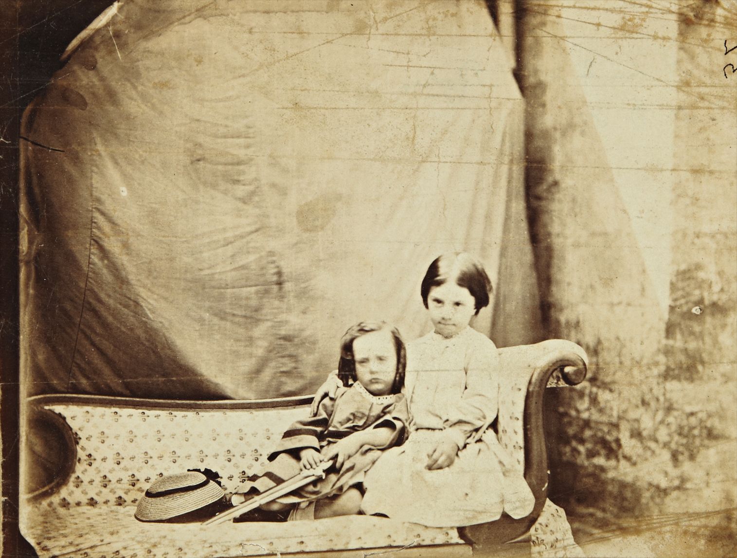 A tender Victorian photograph by Lewis Carroll capturing two young subjects, Annie and Henry Rogers, believed to have been taken around 1860. The image reflects Carroll's well-documented passion for portrait photography, a pursuit he undertook with great seriousness alongside his literary career. The handwritten annotation on the mount, added in an unidentified hand, provides a rare archival notation attributing the work to Dodgson and offering a tentative date for this intimate childhood portrait.