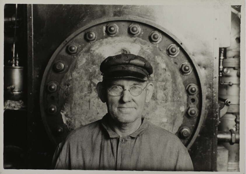 Industrial machinery and human labor converge in this powerful study of American manufacturing in the 1920s. Hine's careful composition transforms a routine workplace scene into a monument to the dignity of manual work.