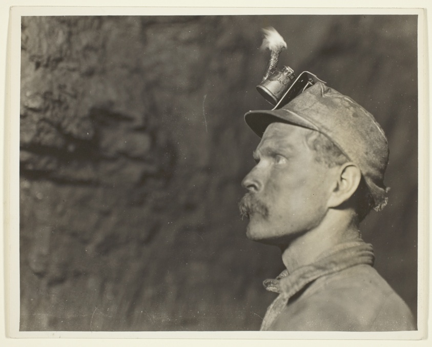 Underground mining photography reaches artistic heights in this dramatically lit image of a Welsh immigrant worker. The interplay of light and shadow creates an almost spiritual quality while documenting dangerous working conditions.
