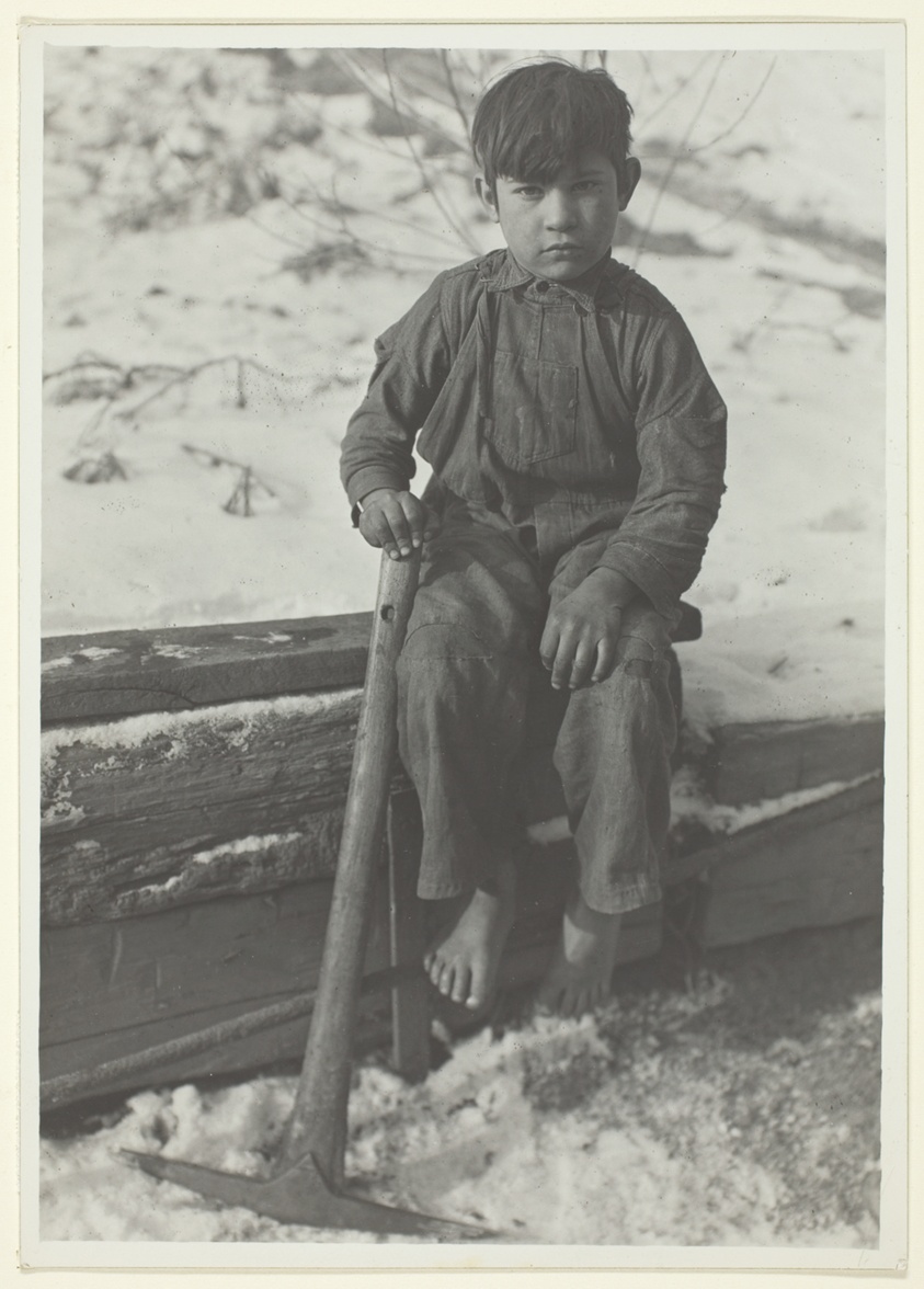 Economic hardship persists into the Depression era, evident in the worn clothing and serious expression of a miner's son.