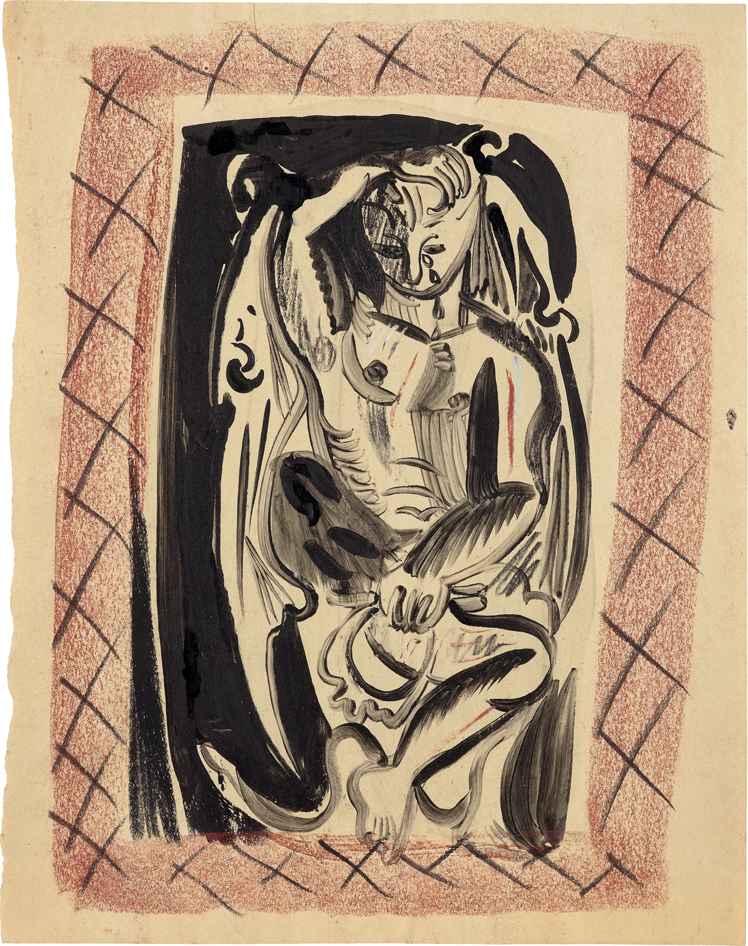 Louis Fratino's 'The Devil' employs unconventional materials of glue and ink on newsprint to create a figure work from 2018. The use of found material and graphic technique reflects contemporary mixed media approaches.