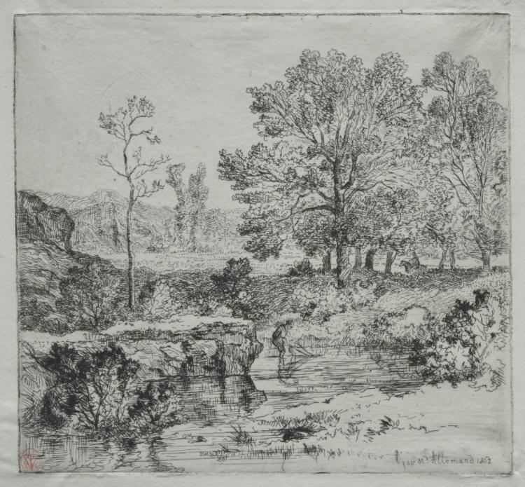 This etching by Louis Hector François Allemand depicts a contemplative figure engaged in shrimp fishing at the boundary between cultivated land and wilderness, capturing a moment of quiet labor in nature. The composition emphasizes the transitional space suggested by the title, with the forest edge creating a dramatic atmospheric backdrop that contrasts with the foreground activity. Allemand's skillful use of the etching medium creates tonal depth and texture that brings both the figure and landscape into vivid relief.
