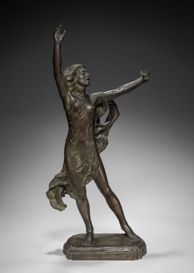 Art Nouveau influence meets American bronze casting in this graceful sculptural interpretation of Robert Browning's dramatic poem about young love and artistic inspiration.