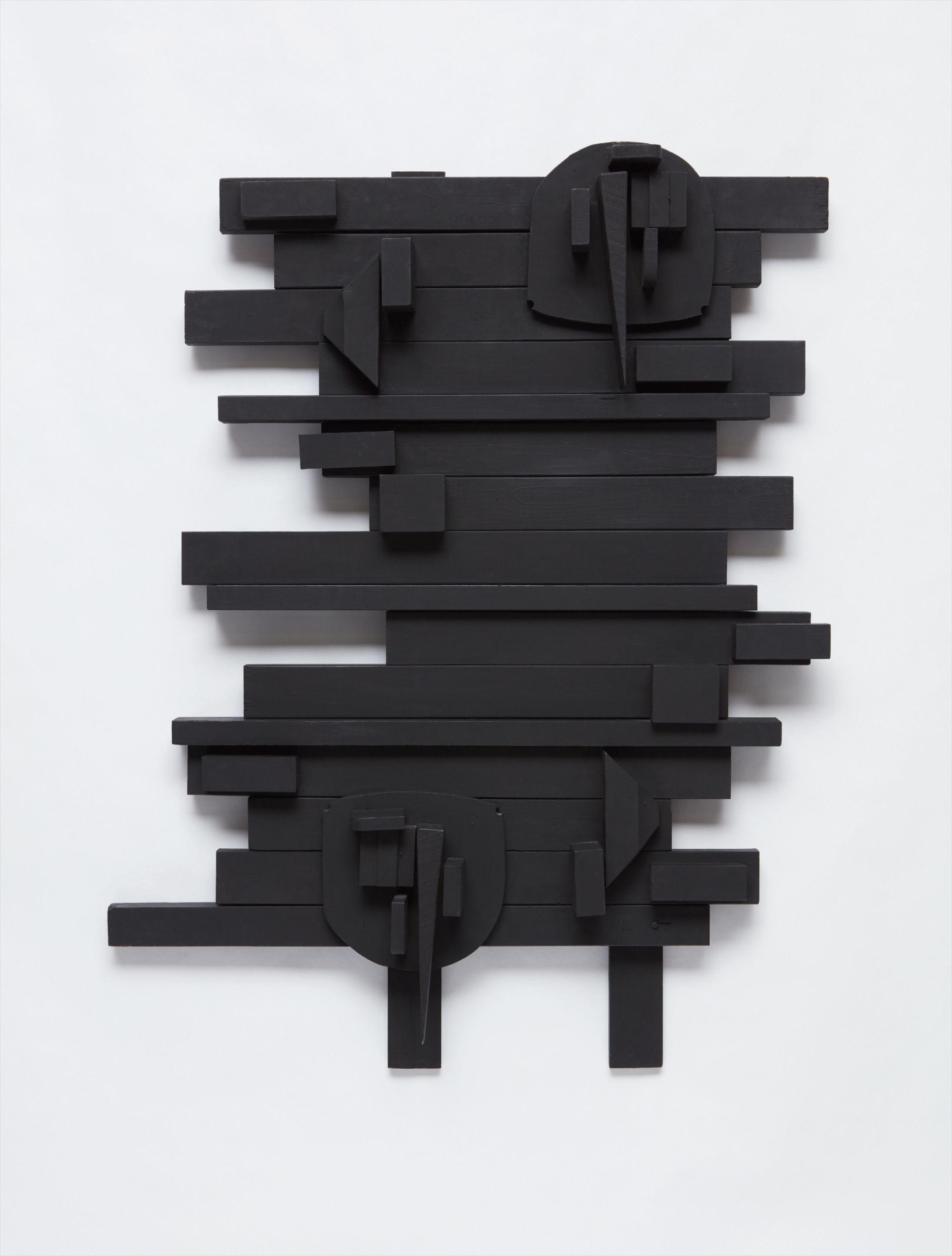 Louise Nevelson's 1959 work is a monumental assemblage of painted wood elements signed by the artist in the upper center. The sculpture exemplifies Nevelson's signature approach of transforming found wooden objects into cohesive abstract compositions.